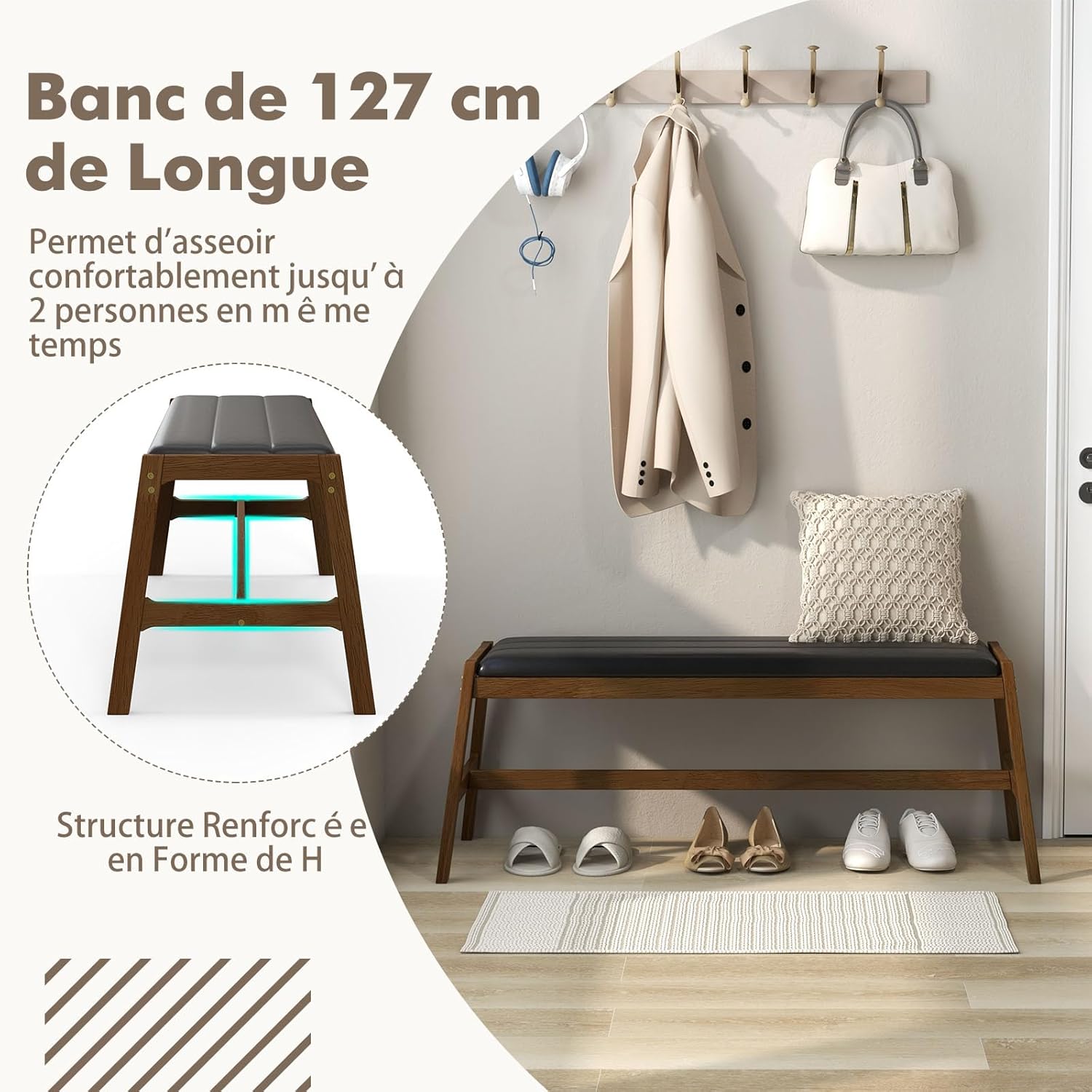 Structure en bois massif robuste. Le banc de cuisine est construit avec un cadre en bois de caoutchouc, assurant une excellente robustesse et résistance à la déformation. Renforcé par une traverse robuste en forme de H, le long banc d'entrée promet une capacité de charge plus élevée.