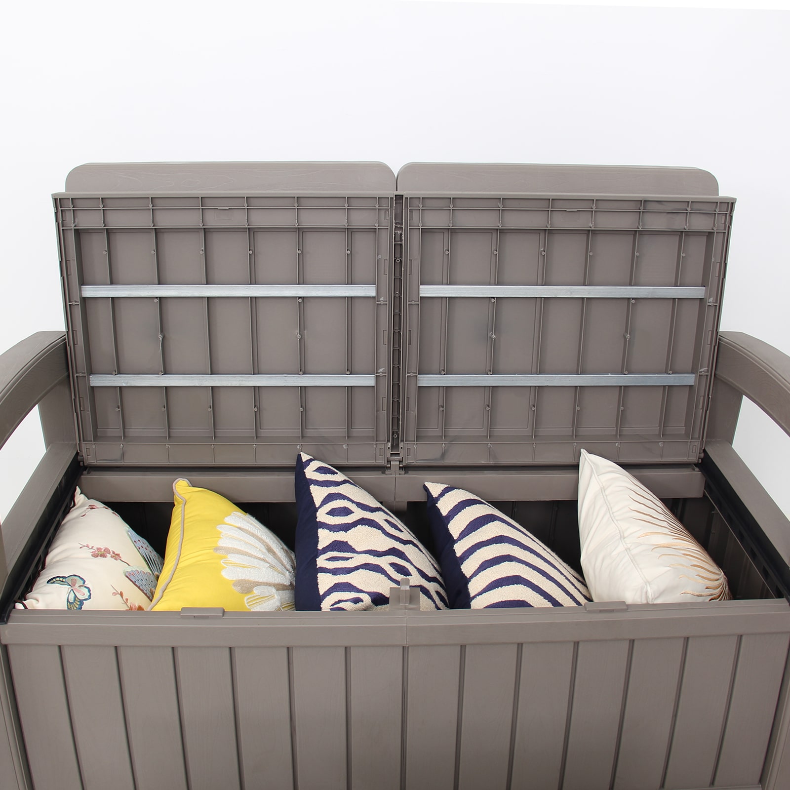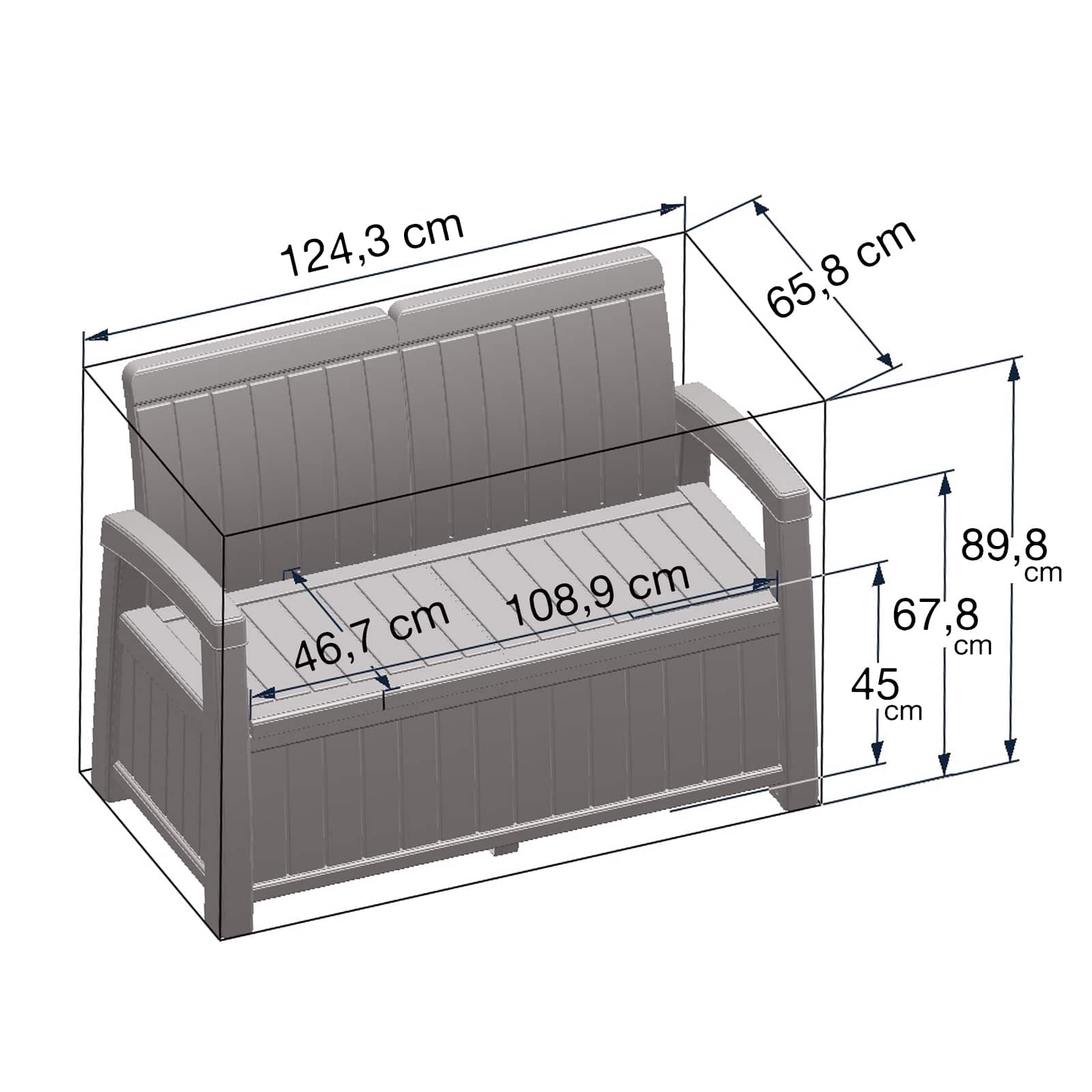 Ce banc coffre de jardin en résine Vita Light a une capacité de 230 litres pour ranger les outils de jardin, les accessoires de piscine, les jouets, les coussins, etc. Le banc offre des sièges renforcés avec un support inférieur en métal pour plus de stabilité. Il dispose également de dossiers et d'accoudoirs qui permettront un grand confort pour deux adultes. Il supporte un poids maximum de 200 kg. Il est fabriqué en polypropylène durable et recyclable avec une structure métallique pour une plus grande résistance et stabilité. Vous pouvez le placer aussi bien à l'intérieur qu'à l'extérieur car il est protégé contre les rayons UV et résiste aux intempéries. Placez ce banc avec possibilité de rangement dans le porche, le jardin ou la terrasse et vous pourrez avoir vos outils et votre équipement d'extérieur bien rangés et protégés de la pluie, de la poussière et de l'humidité. Pour accéder au compartiment de rangement, vous pouvez le faire en soulevant la base du siège facilement et sans effort. Caractéristiques : - Dimensions extérieures : 124 x 67 x 90 cm. - Dimensions intérieures : 109 x 47 x 45 cm. - Capacité du coffre : 230 litres. - Capacité du banc : 200 kg (2 personnes). - Poids : 17 Kg. - Matériau : polypropylène et métal. - Épaisseur du dossier et des accoudoirs : 7,7 cm environ. - Type de porte : à double pliage. - Type d'union : vis et carrés. - Couleur : gris. - Espace recommandé : 134 x 77 cm. - Protection contre les UV : oui. - Entretien : nettoyage avec de l'eau sous pression / un chiffon humide.