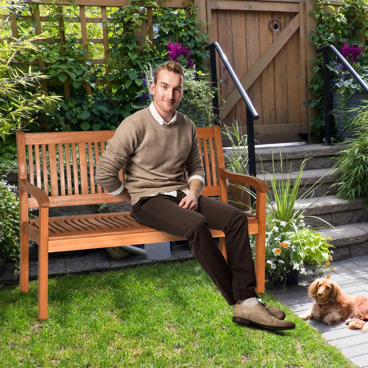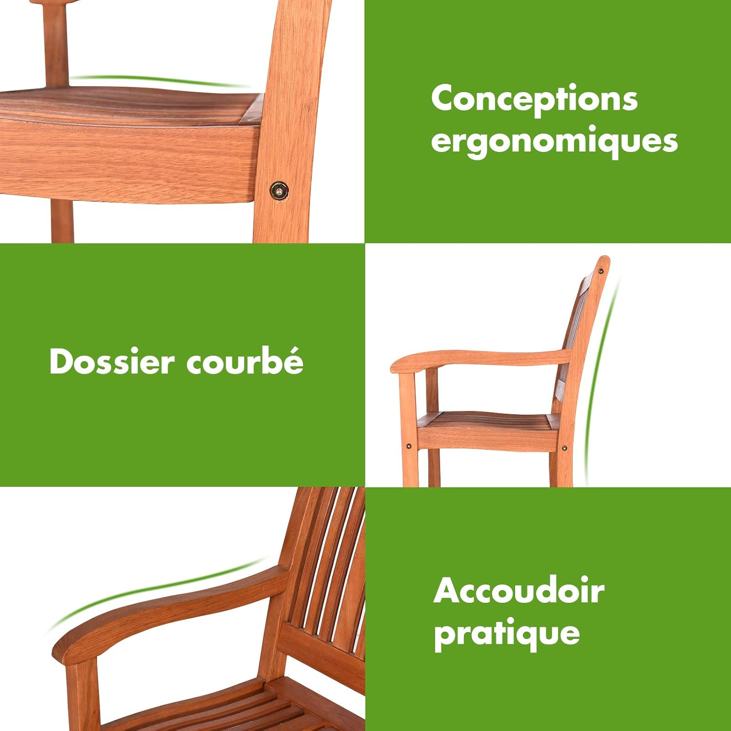 - Barres en bois disposées verticalement : Les barres de bois du siège sont disposées verticalement et 6 barres de bois grossier y sont disposées. Les barres en bois grossier et les espaces vides appropriés augmentent considérablement la stabilité de la face du siège. En même temps, le bois d’acacia a une surface lisse, ce qui rend son assise confortable.