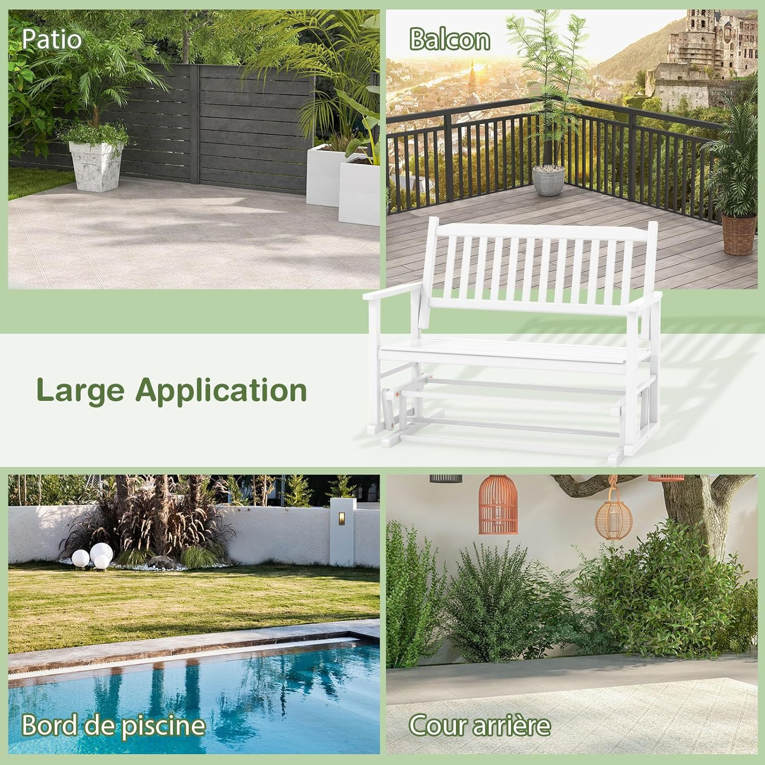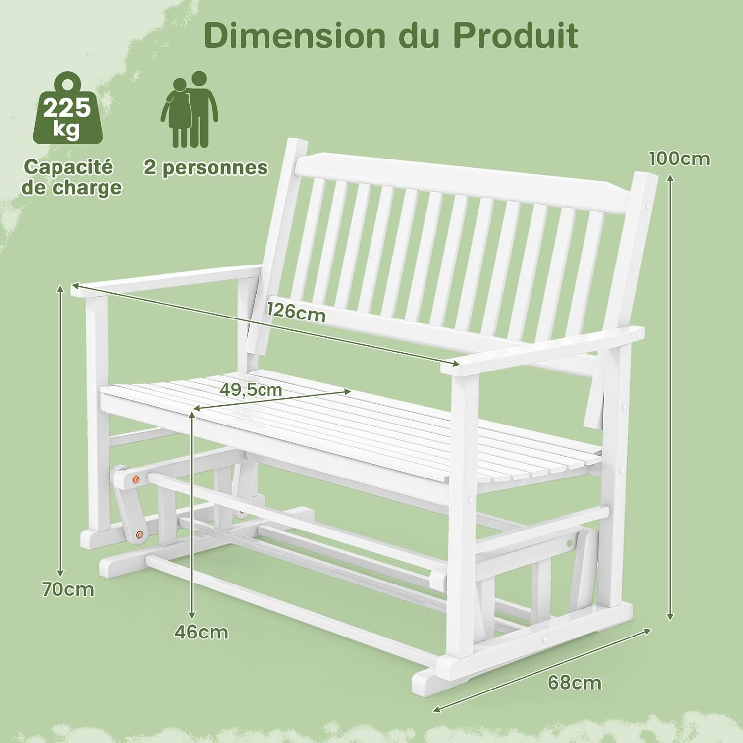 - Bois de peuplier solide : Cette chaise balancelle de terrasse est fabriquée en bois de peuplier de haute qualité qui est sans bavure, stable, durable et moderne. De plus, la peinture PU sélectionnée assure sa longévité.