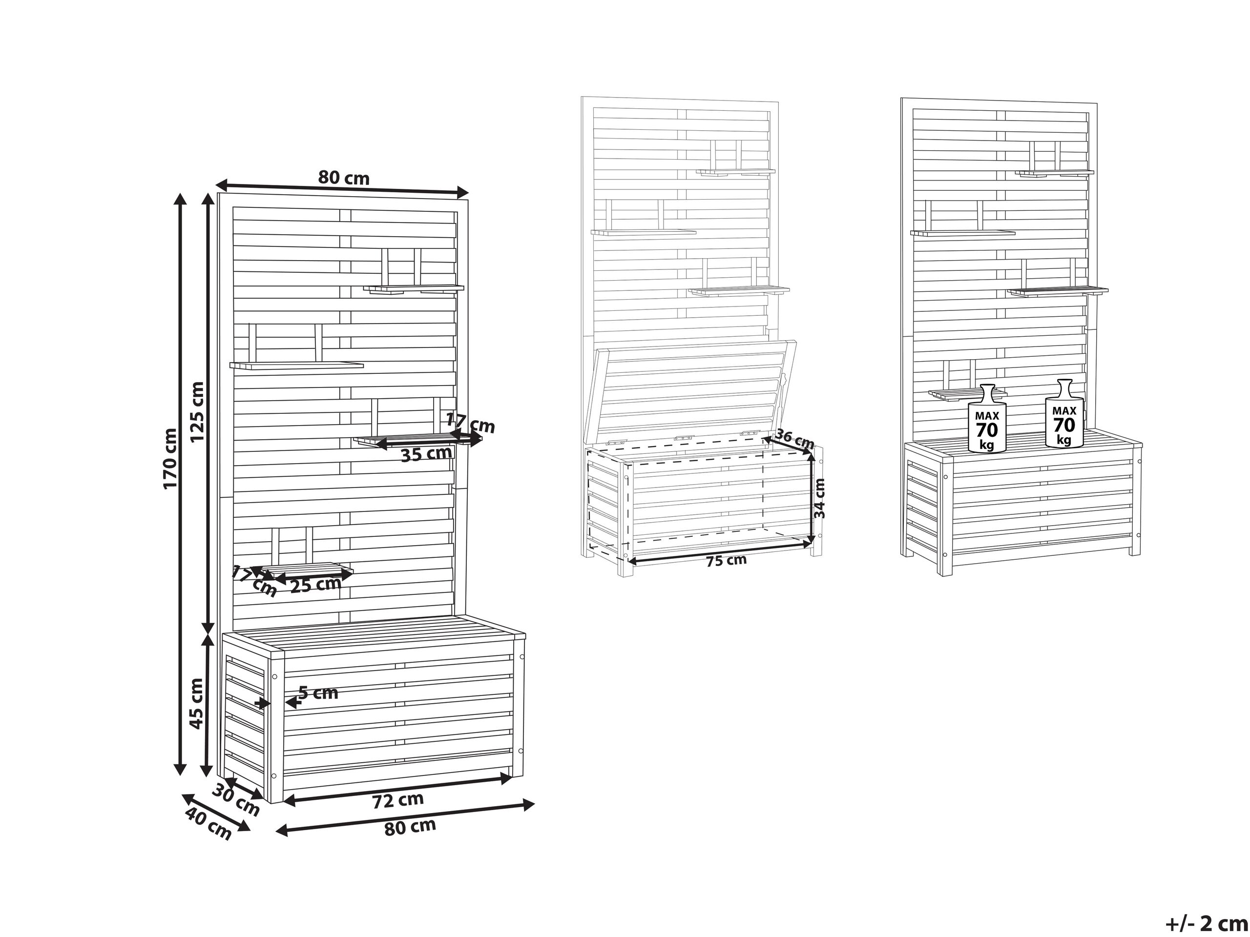 Banc d'extérieur. Ce combo banc, boîte de rangement et étagères remplira l'espace de votre balcon. Entièrement réalisée en bois d'acacia massif, la structure est durable et naturellement résistante aux conditions extérieures. La couleur chaude des planches peut transformer n'importe quel espace de terrasse en un endroit confortable et rustique. Les étagères mobiles offrent de l'espace pour les plantes ou les herbes en pot, et le rangement sous la banquette permet de ranger des ustensiles de jardin ou des coussins de siège. Ajoutez des décorations extérieures, asseyez-vous et profitez du temps passé au grand air.