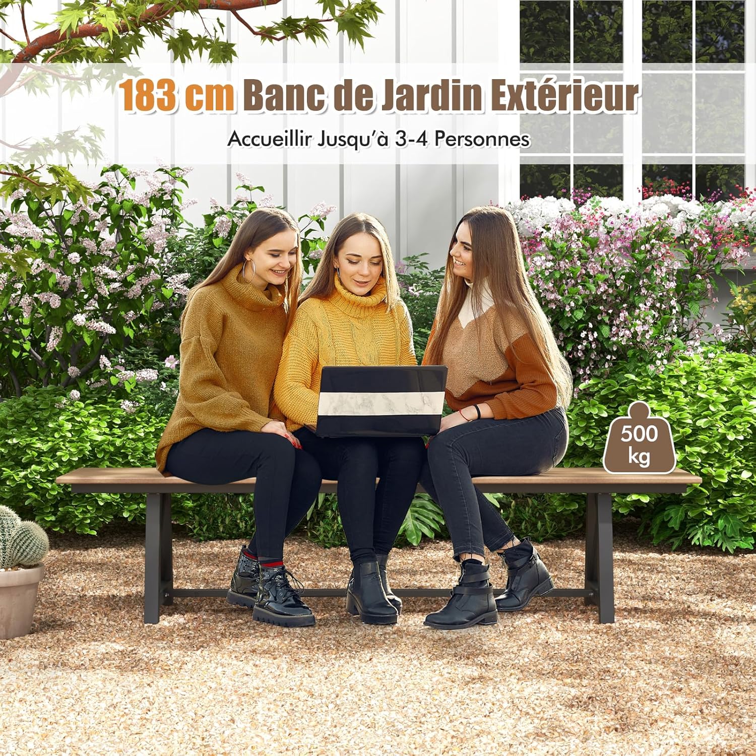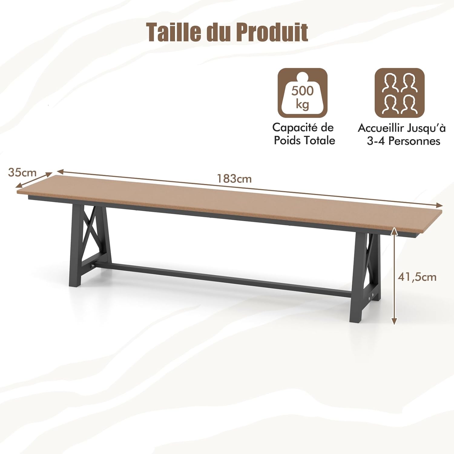 - Banc de Jardin Extérieur de 183 cm : Assez spacieux pour accueillir confortablement jusqu'à 3-4 personnes, ce banc de 183 cm de long est parfait pour recevoir des invités ou profiter d'un moment paisible seul. Il supporte jusqu'à 500 kg, ce qui en fait un choix fiable.