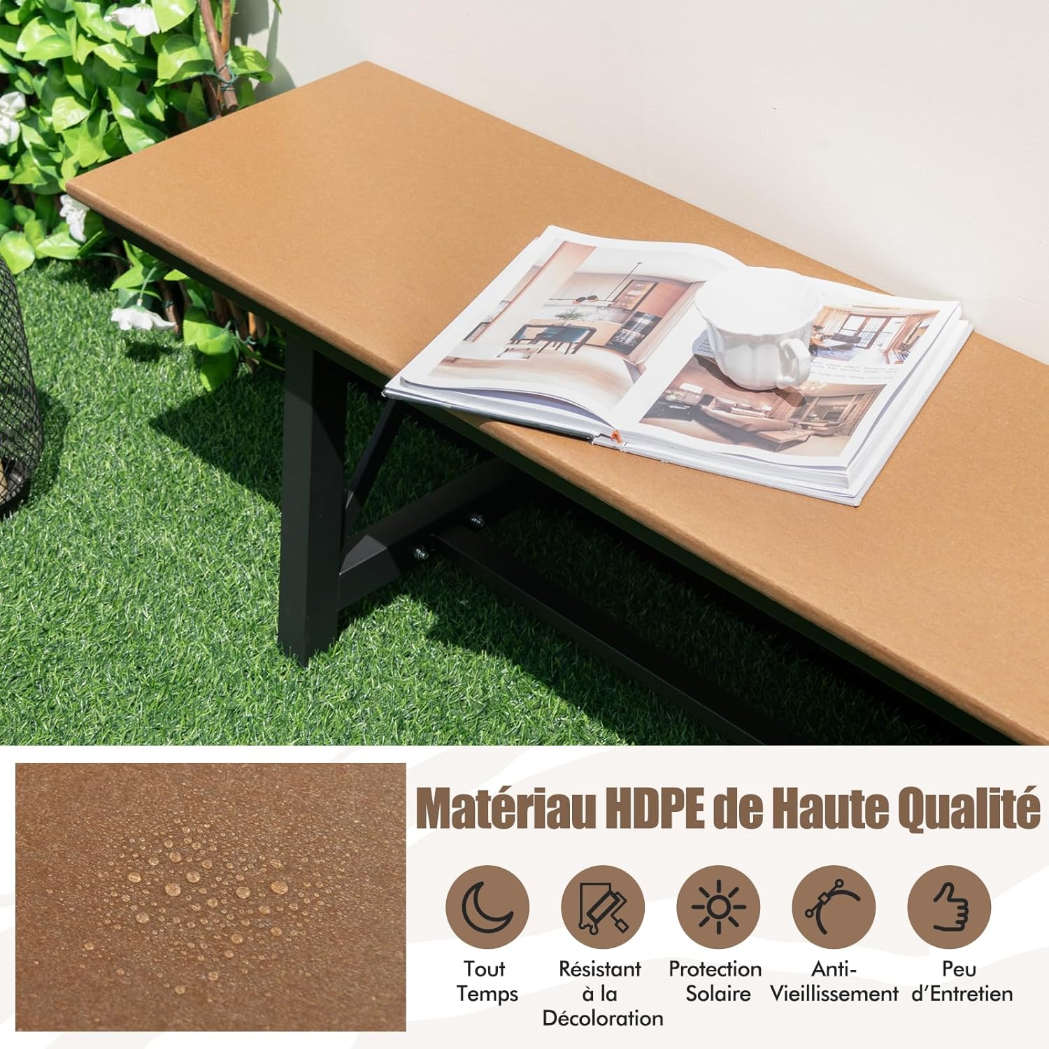 - Matériau HDPE de Qualité Supérieure : Comparé à d'autres matériaux en bois traité ou en polystyrène, notre banc extérieur est fabriqué en cadre HDPE de haute qualité qui imite le bois réel mais qui est en réalité plus robuste et plus résistant. Il est tout temps, non-fading, protecteur contre le soleil et anti-vieillissement.