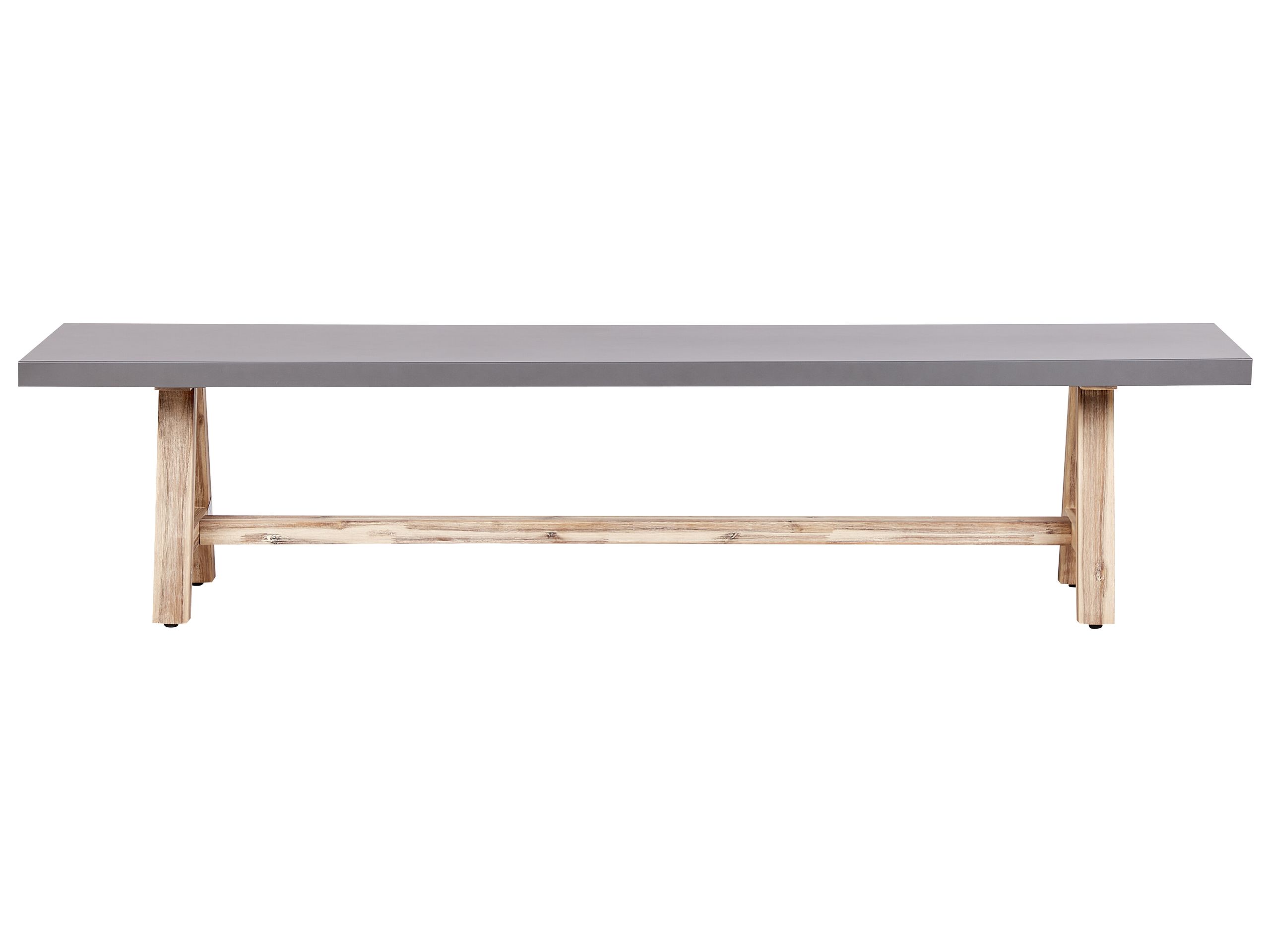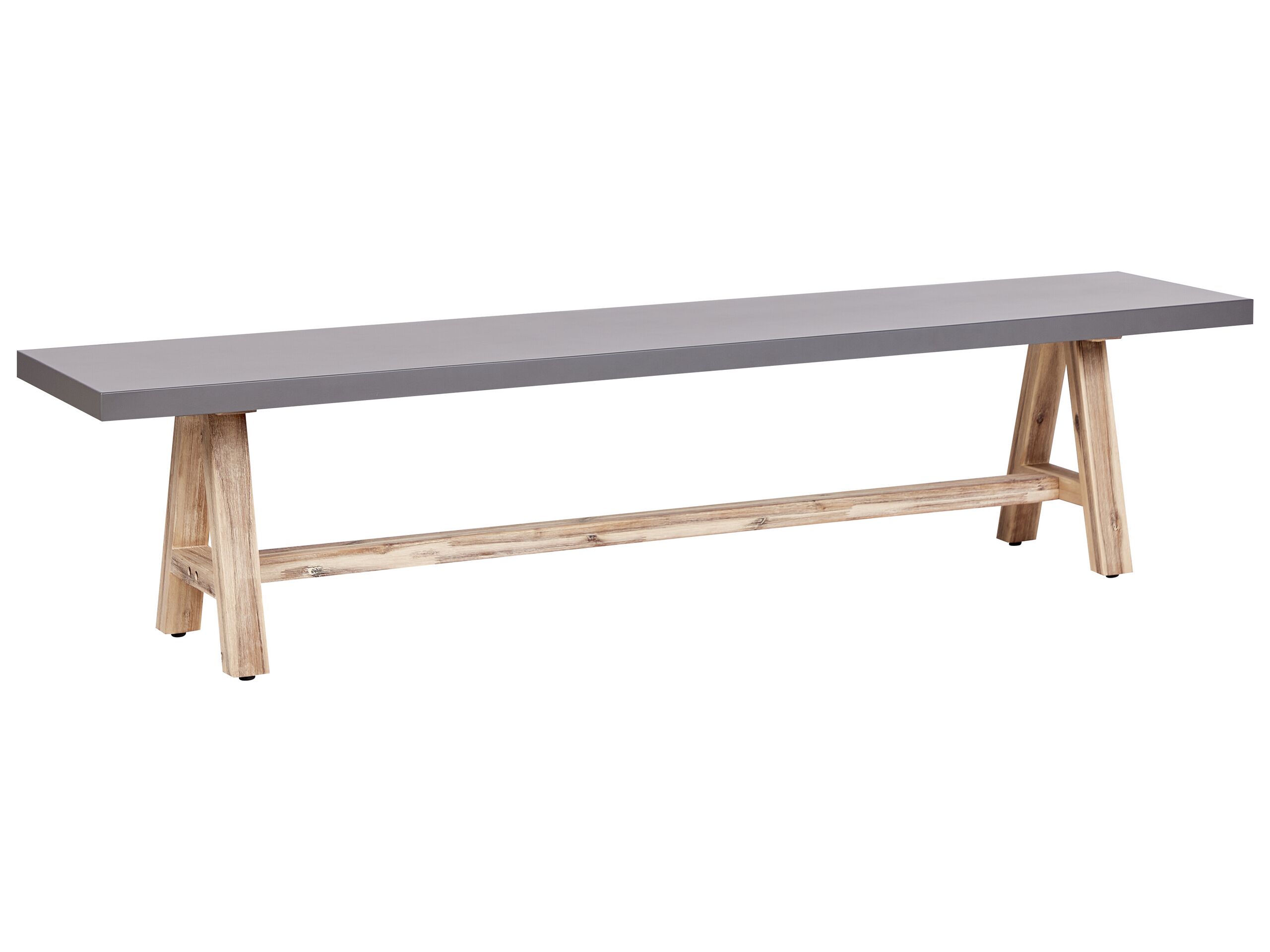 Banc d'extérieur en béton avec pieds en bois. Ce banc de jardin se caractérise par une assise en béton lisse et solide, associée à des pieds robustes en bois d'acacia. L'association du béton gris et des tons clairs du bois crée un look contemporain qui convient à divers environnements extérieurs. Le banc est conçu pour durer et être confortable, offrant un espace d'assise élégant et fonctionnel dont vous pourrez profiter pendant de nombreuses années.