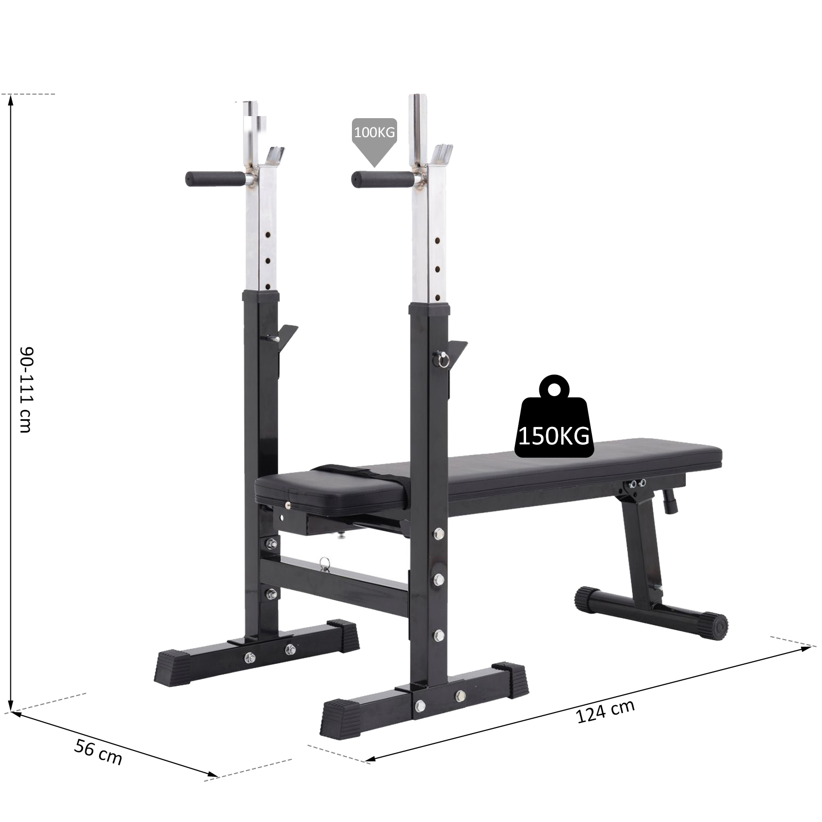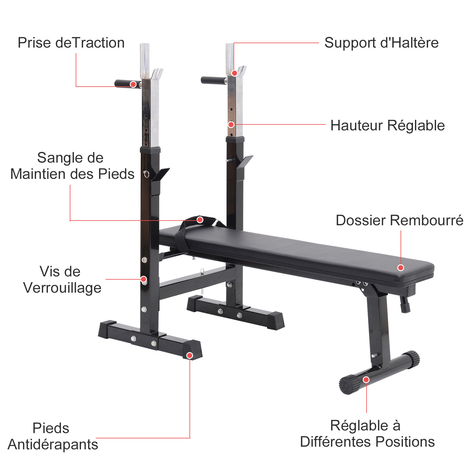 - Stabilité et sécurité optimums d'utilisation : matériel fabriqué en acier Q195 robuste, pieds antidérapants, sangle de maintien du banc en position pliée