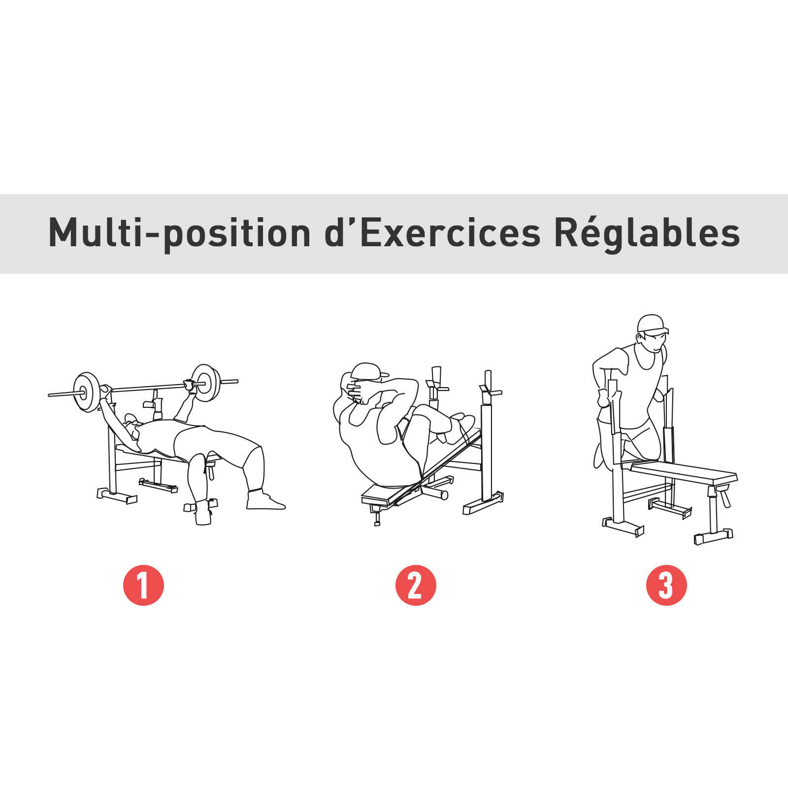 - Banc de musculation Fitness complet vous offrant de multiples possibilités d'entraînement : dévellopé couché, sit-ups, dips, etc...