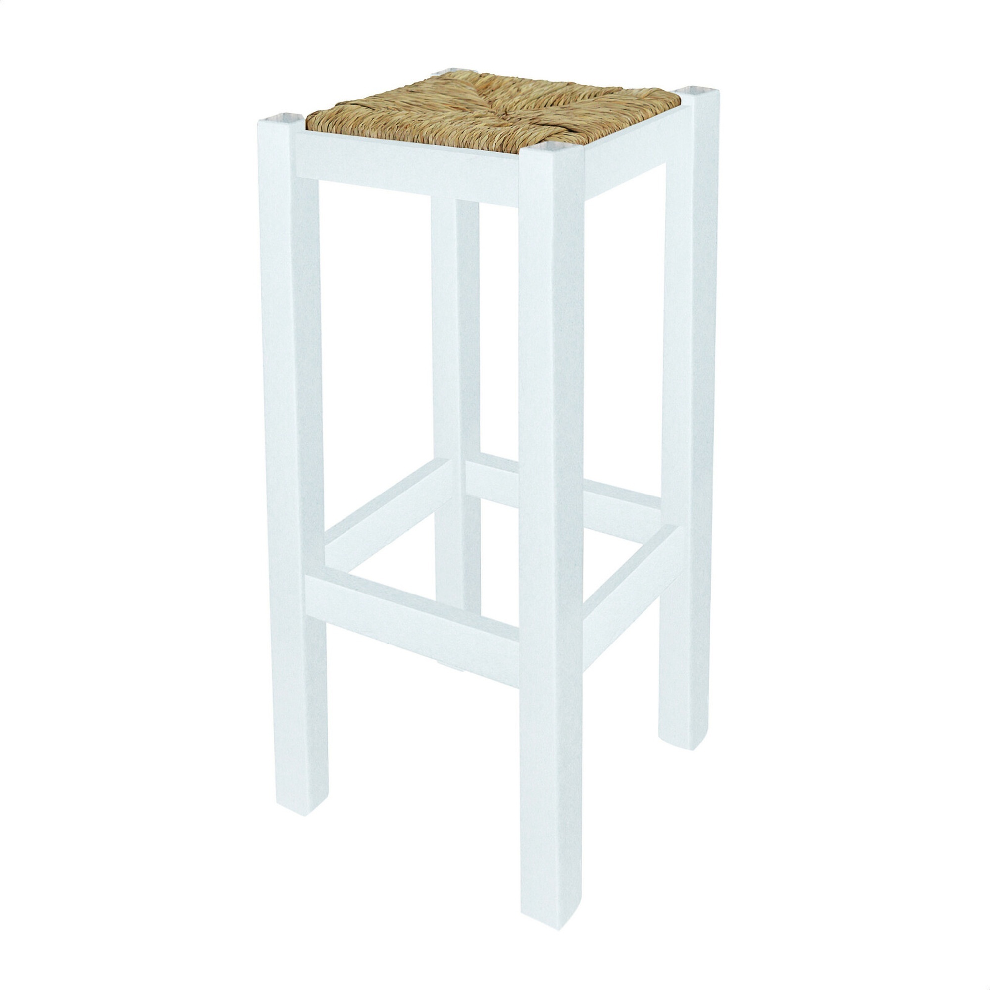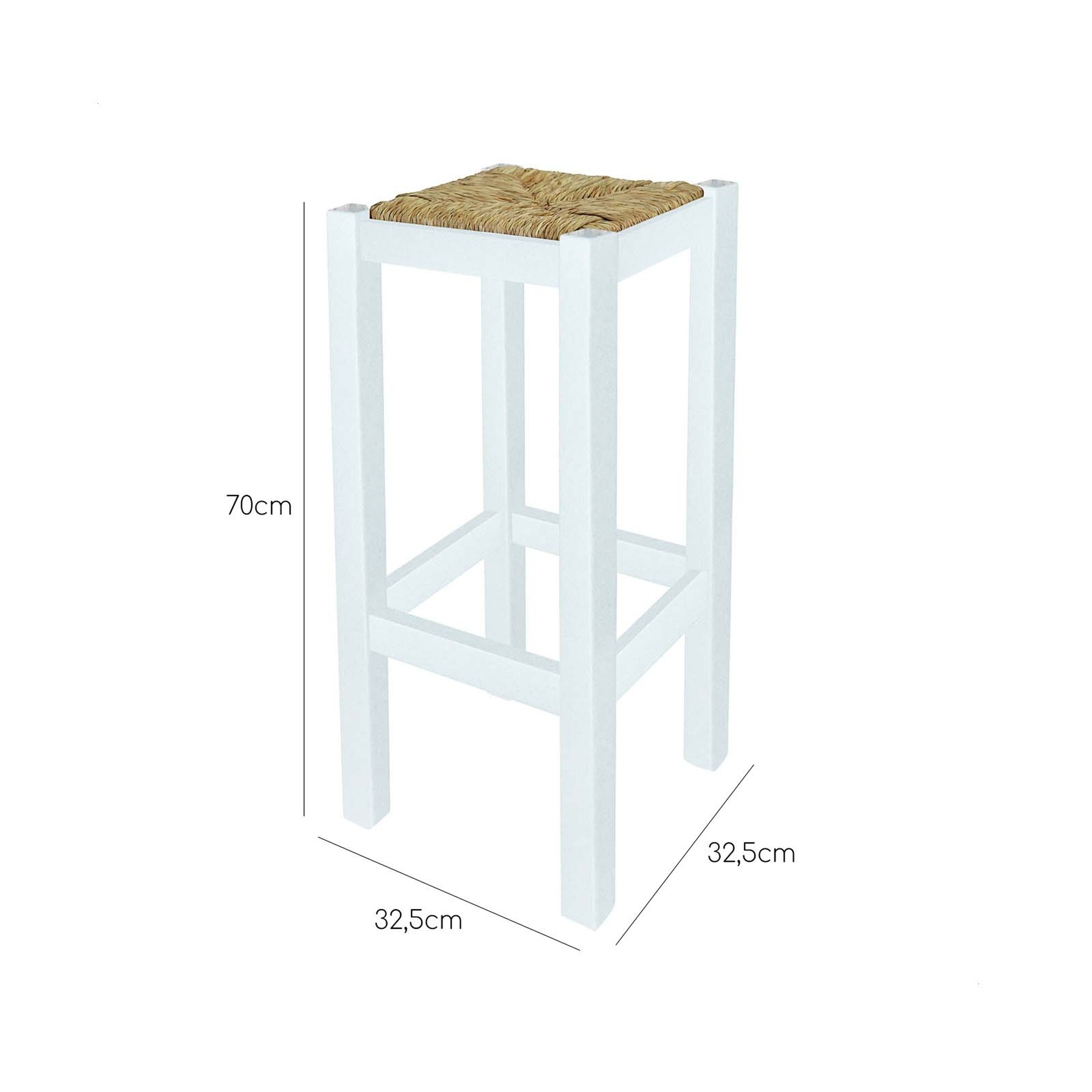 Trottoir rustique carré à haut avec finition blanche, en bois de pin avec siège de paille (L: 32,5 x F: 32,5 x H: 70 cm)