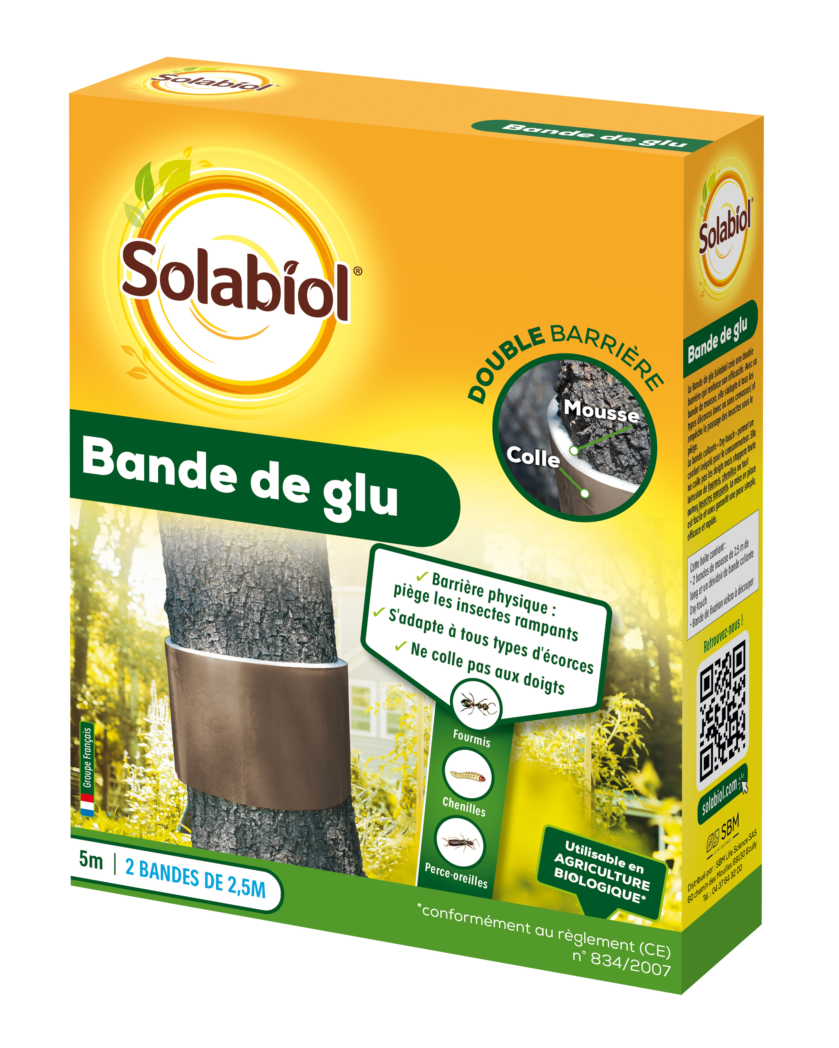 La Bande de glu Solabiol peut servir à surveiller plusieurs infestations d’insectes selon la période d’application autour du tronc des arbres. La cheimatobie (Operophtera brumata), petit papillon brun-gris, cause de graves dégâts sur les arbres fruitiers et les arbres d’ornement. Les femelles, incapables de voler, sortent du sol d’octobre à janvier pour grimper le long des troncs et déposer leurs oeufs dans les branches. Les oeufs éclosent au printemps et les chenilles se nourrissent alors des feuilles et des fleurs. Les jeunes fruits complètent leur repas au mois de juin. Elles se laissent ensuite tomber dans le sol où elles s’enterrent. La fourmi provoque indirectement des dégâts en facilitant la propagation des pucerons au printemps et en été. Le perce-oreille (Forficula auricularia) s’attaque aux fruits mûrs en été et les morsures laissées sont propices au développement des maladies. La Bande de glu Solabiol crée une double barrière qui renforce son efficacité. Avec sa bande de mousse, elle s’adapte à tous les types d’écorces (avec ou sans crevasses) et empêche le passage des insectes sous le piège. La bande collante « Dry-touch » permet un confort inégalé pour le consommateur. Elle ne colle pas les doigts mais stoppera toute intrusion de fourmis, chenilles ou tout autre insectes rampants. La mise en place est facile et vous garantit une pose simple, efficace et rapide.