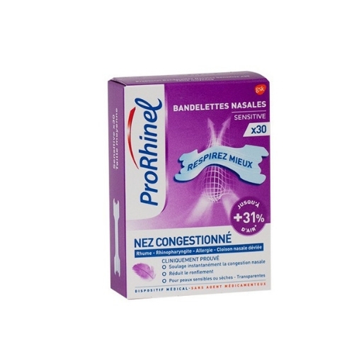 ProRhinel 30 Bandelettes Nasales Sensitive est un dispositif médical sans agent médicamenteux sous forme de bandelettes nasales, recommandé en cas de rhume, rhinopharyngite, allergie, ou encore cloison nasale déviée. Ces bandelettes nasales, version "sensitive" permettent de soulager instantanément la congestion nasale, réduire le ronflement. Elles améliorent le passage de l'air de près de 31%. Transparentes. Taille moyenne. Peaux sensibles ou sèches.