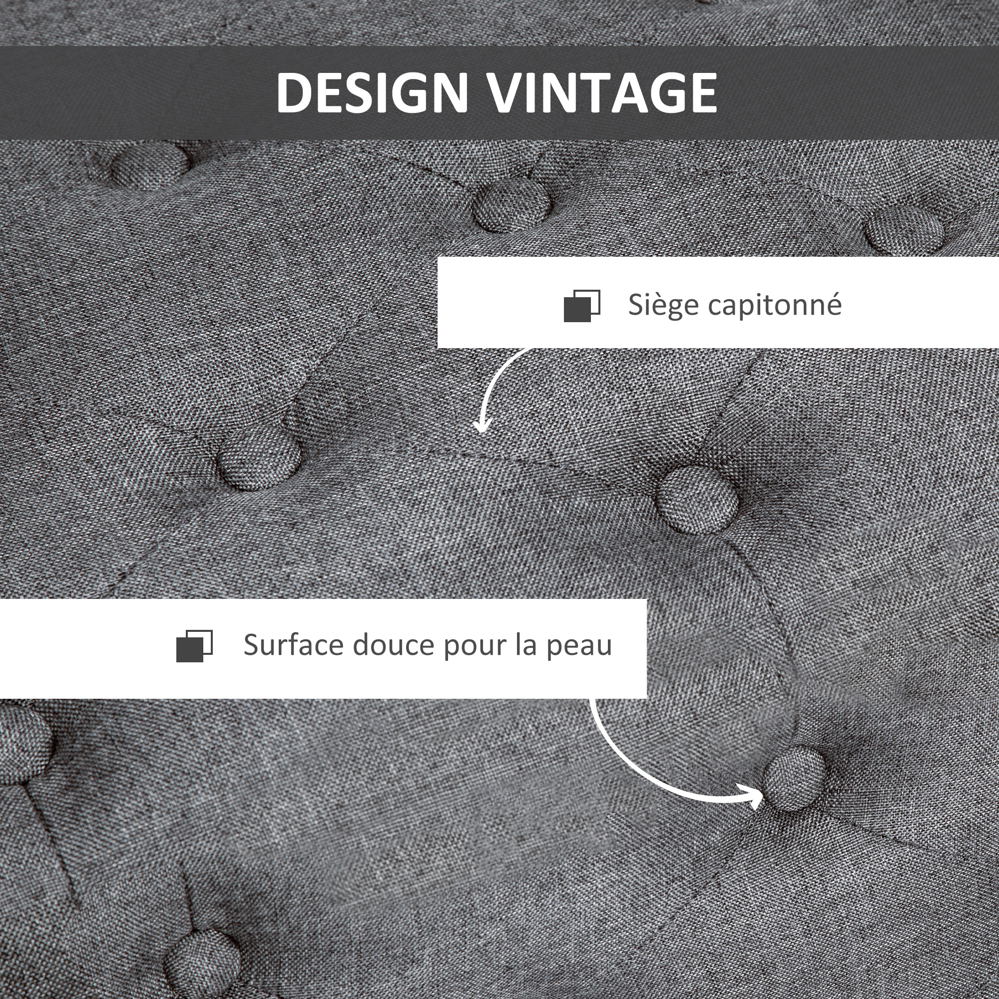 | Libellé | Banquette coffre de rangement style Chesterfield dim. 100 x 40 x 44 cm piètement bois noir tissu anthracite |