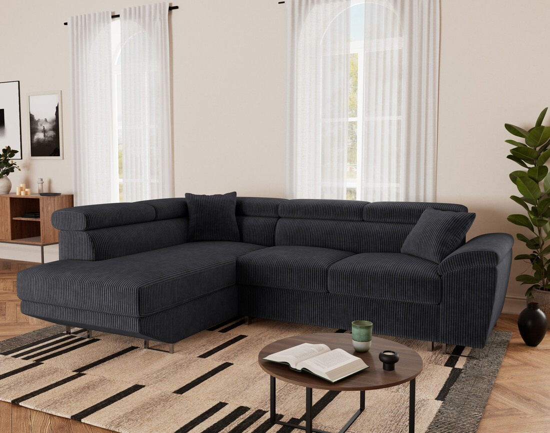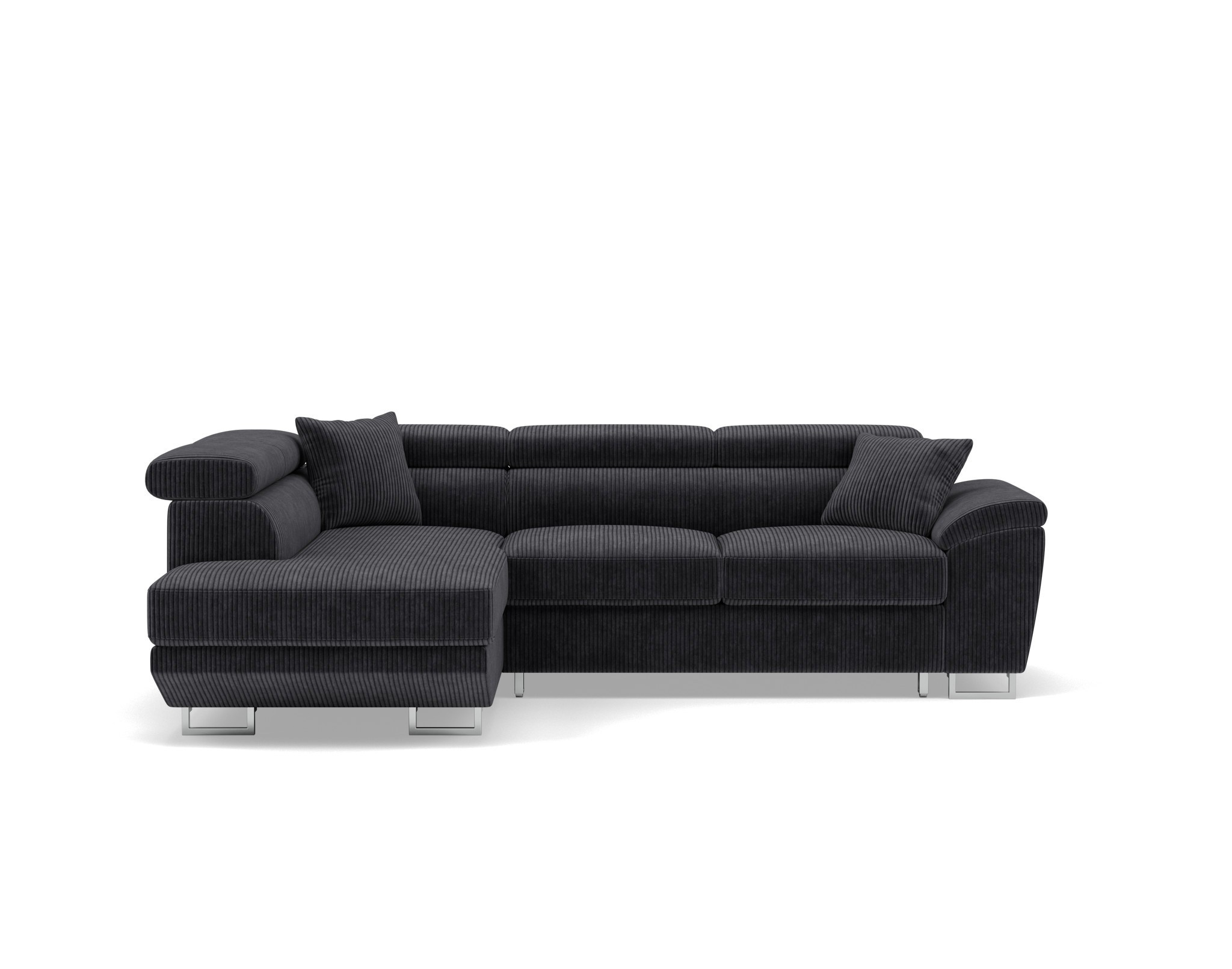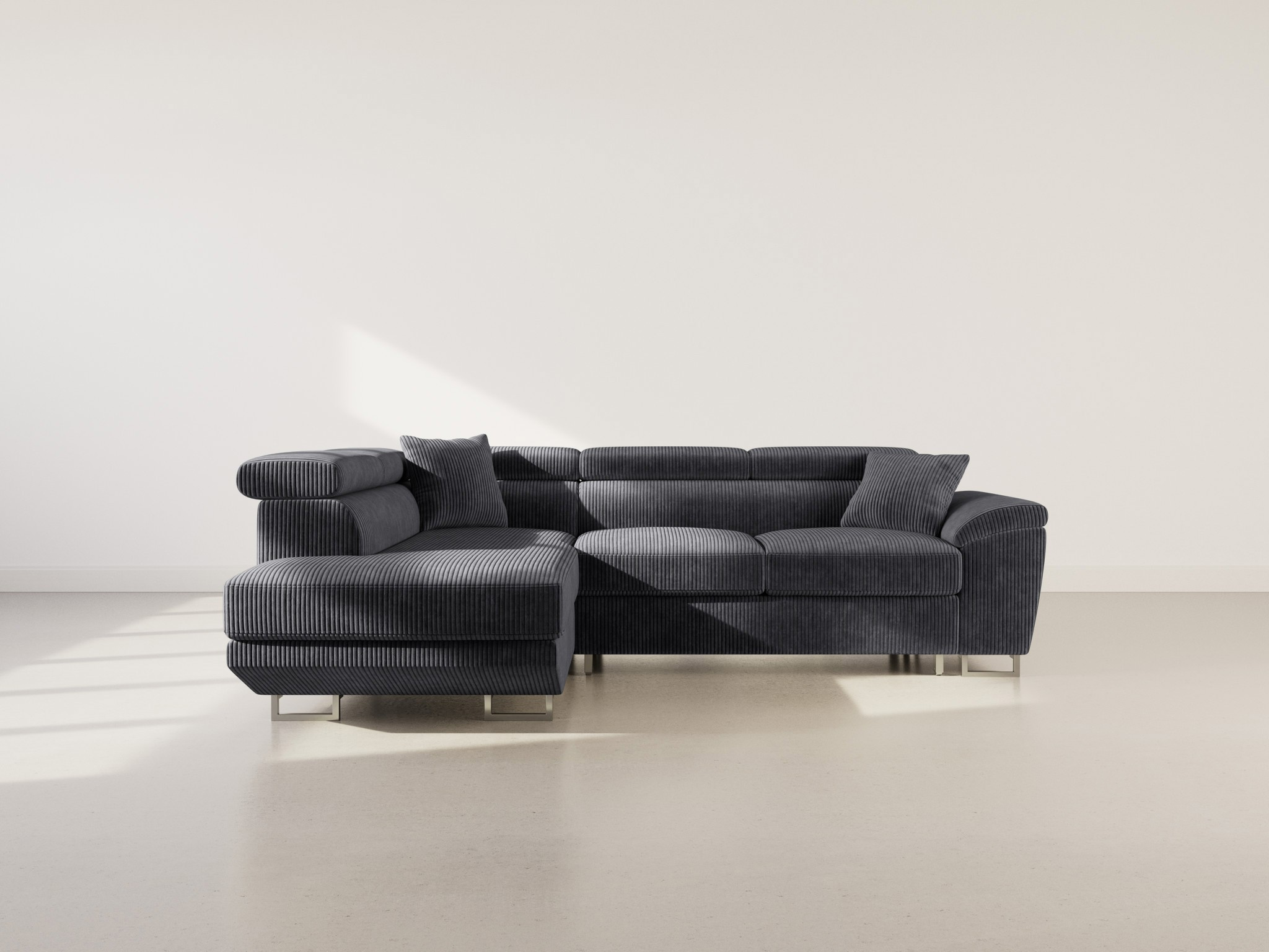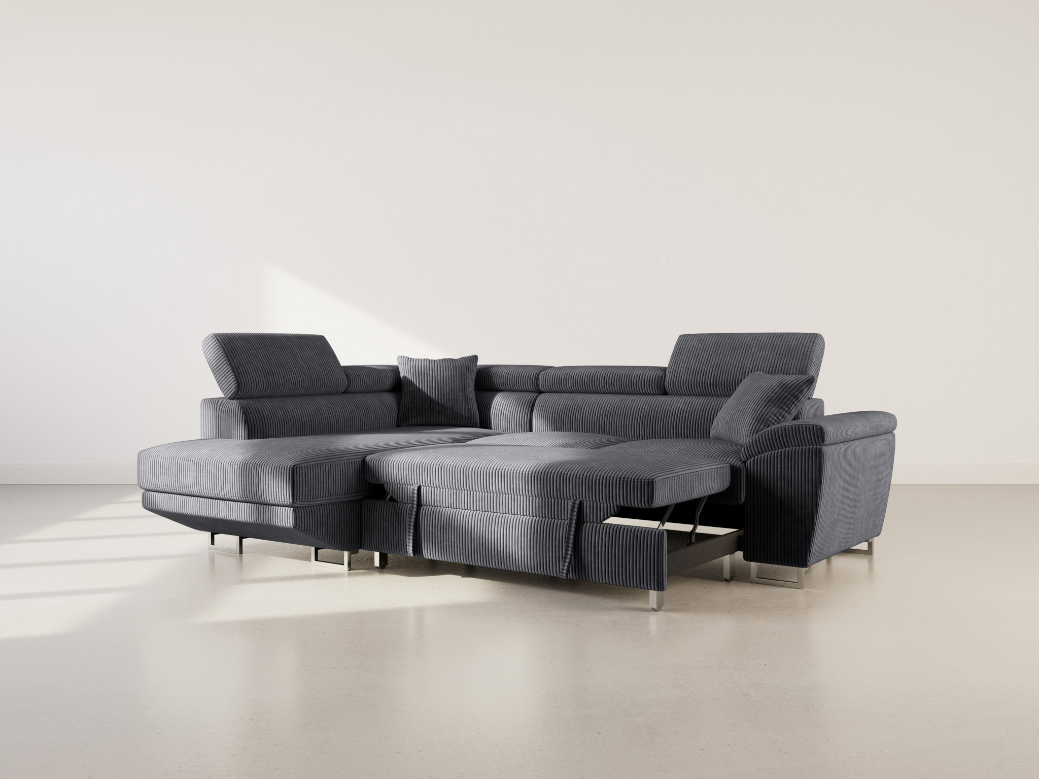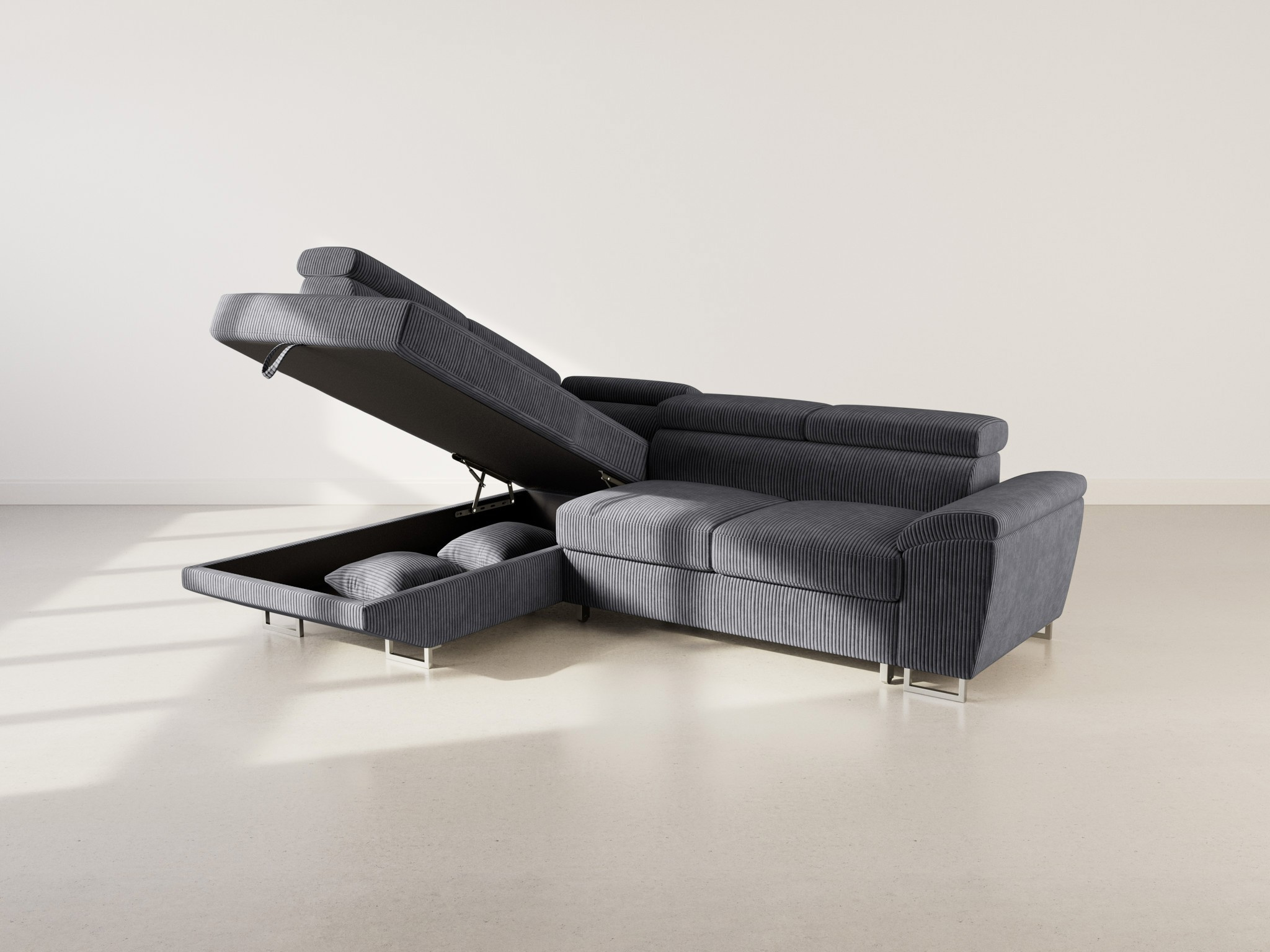 Baoji - Canapé d'angle gauche 5 places convertible avec têtières et coffre en velours côtelé