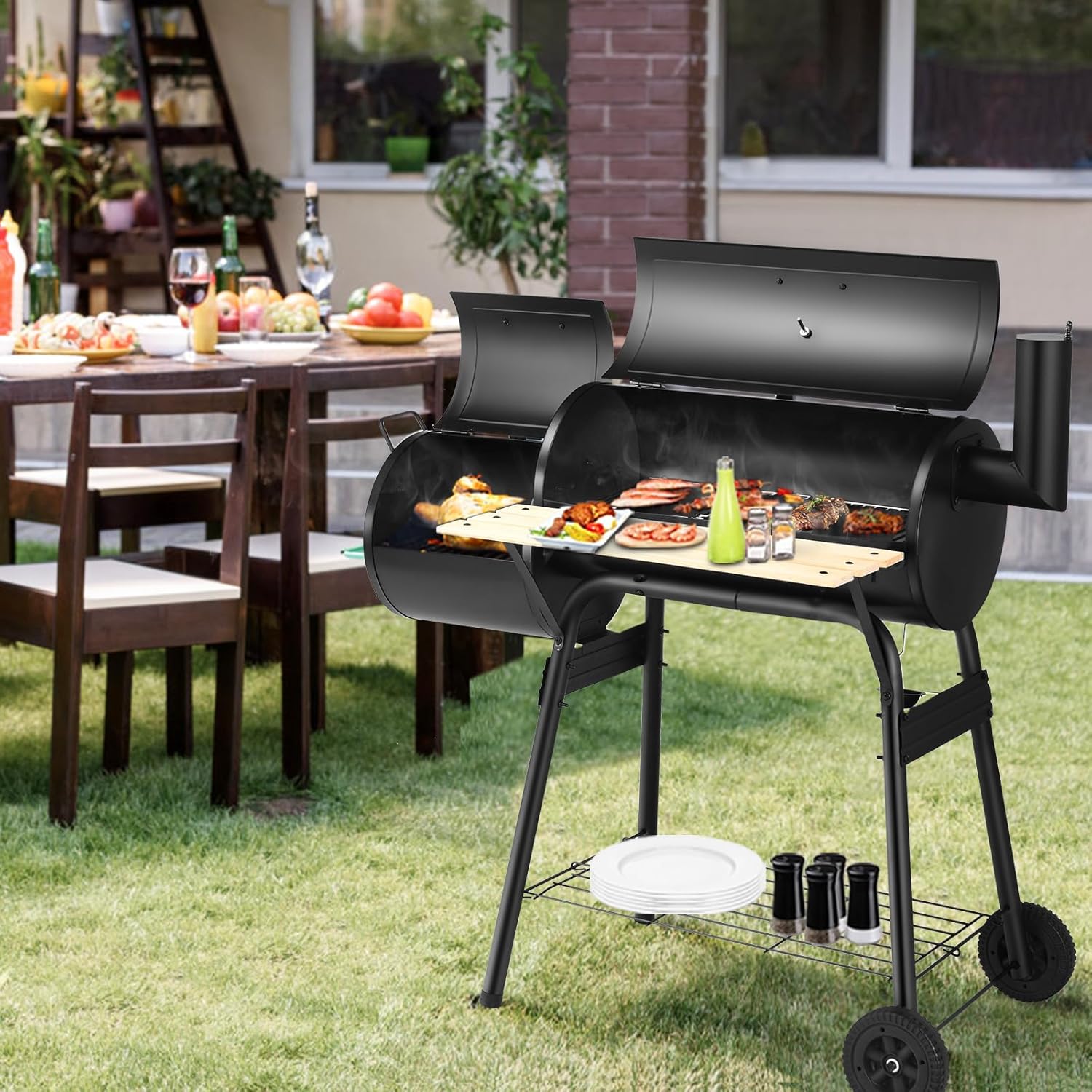 - Double grille : ce barbecue au charbon est conçu avec 2 grilles pour vous offrir plus d'espace de cuisson et également pour faciliter la cuisson de différents ingrédients en même temps, et la table latérale en bois garde vos couverts et épices à portée de main.