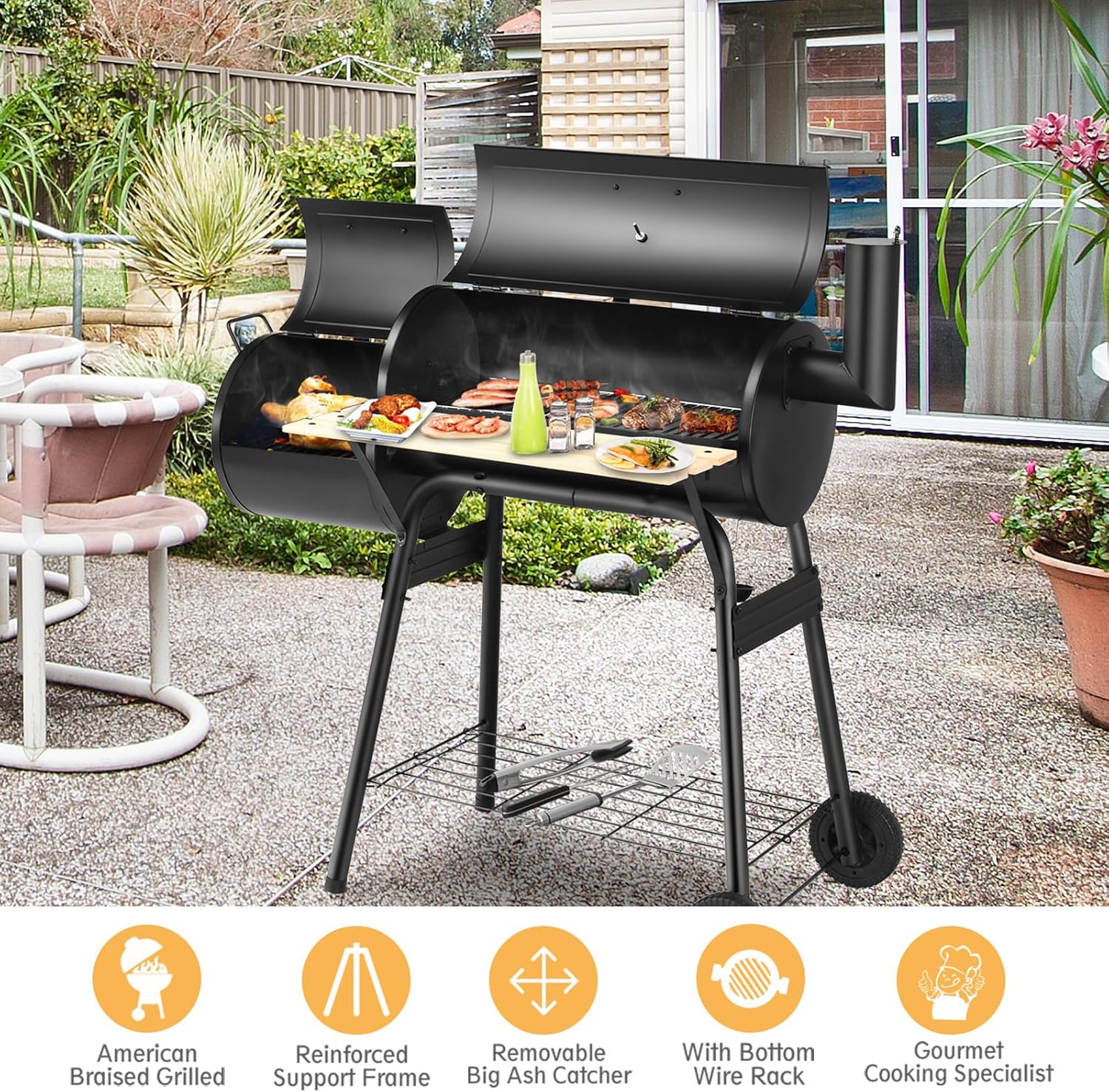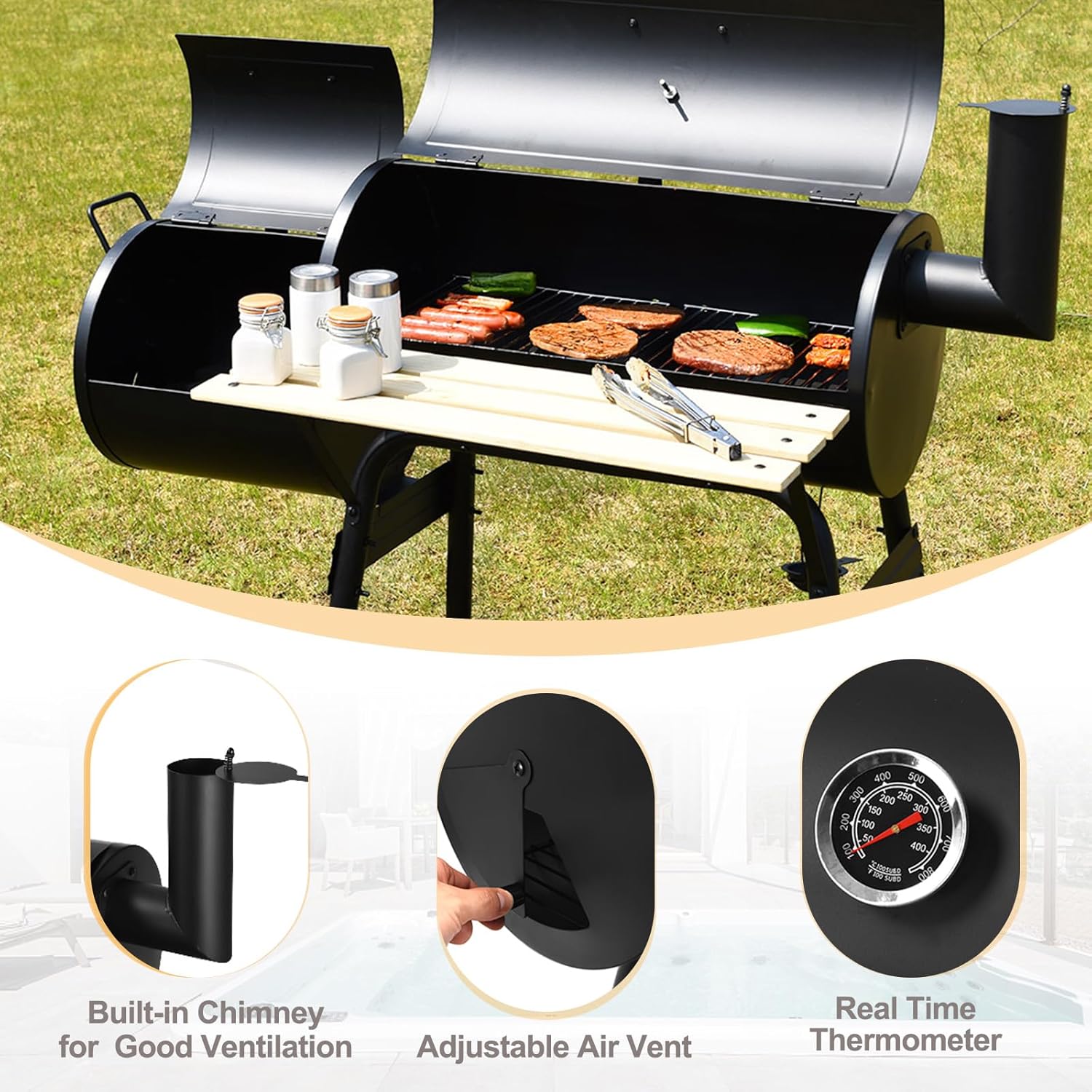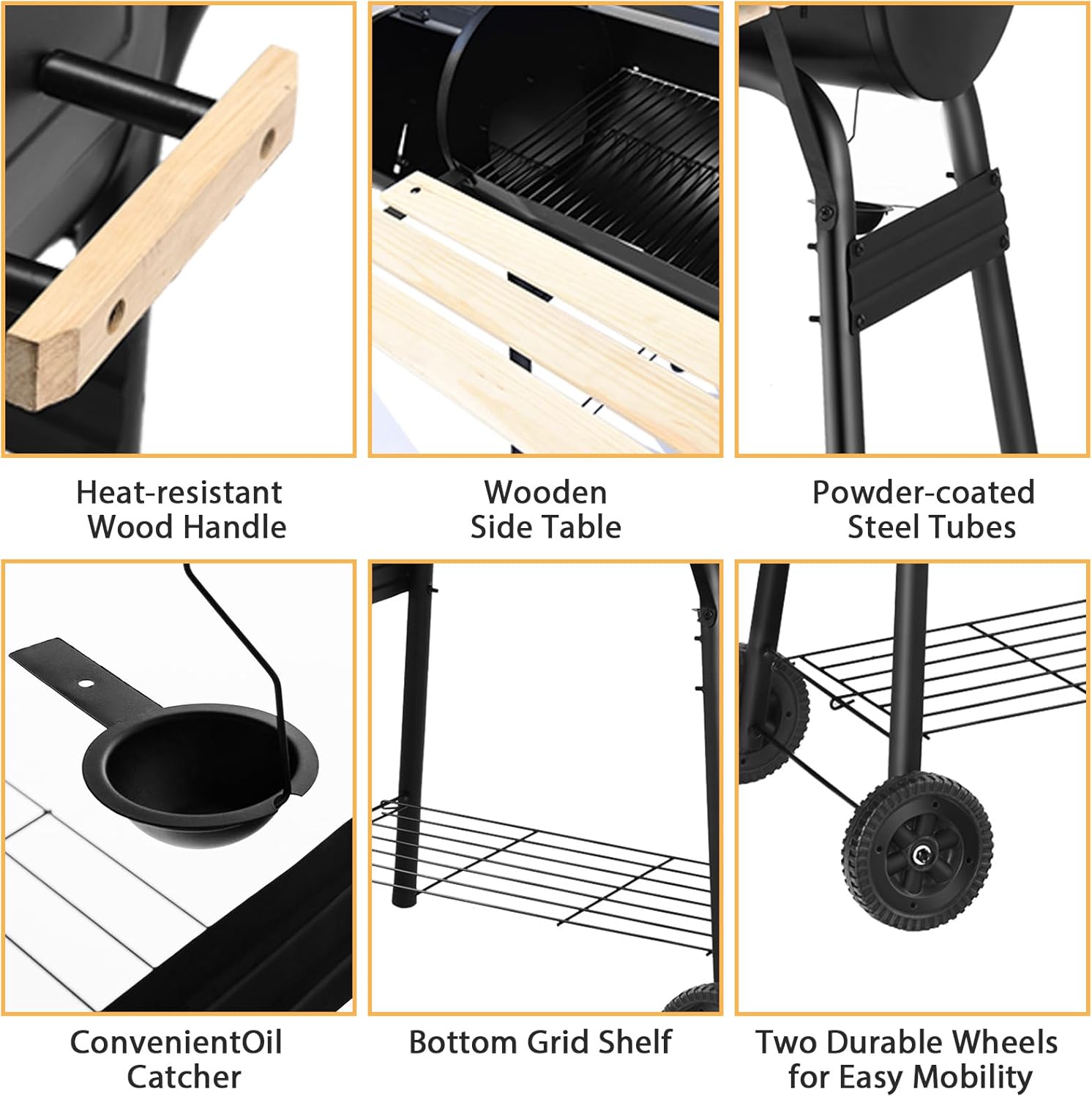 - Design pratique : il y a une étagère ouverte sur la partie inférieure du barbecue pour le bois de chauffage ou d'autres articles. En outre, le collecteur d'huile amovible facilite la manipulation et le nettoyage, et la poignée en bois résistante à la chaleur vous offre plus de confort.
