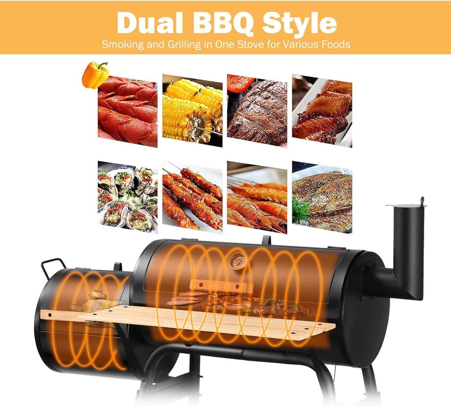 - Cuisson variée : en plus de cuisiner sur le petit gril du barbecue humidifiant, vous pouvez également y brûler du bois. La fumée est canalisée vers la grande grille où elle fume les aliments, leur donnant un goût fumé.