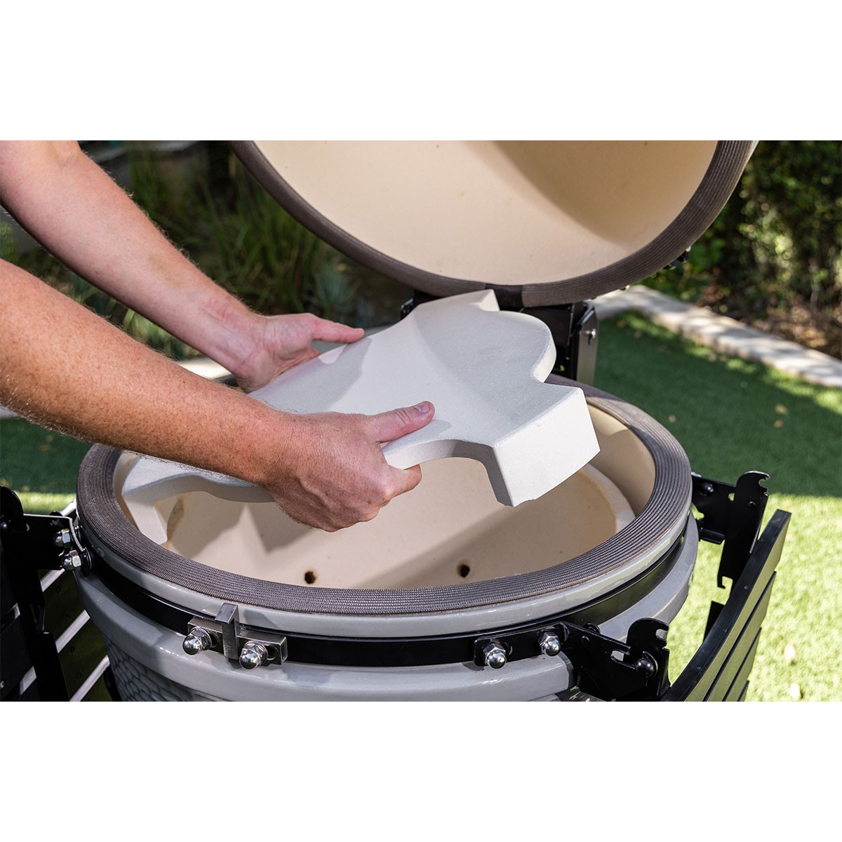 Sa polyvalence de cuisson directe et indirecte est unique. Ce barbecue sait tout faire grâce à son déflecteur de chaleur amovible en céramique qui réparti uniformément la chaleur avec précision et permet de stabiliser la cuisson pendant plusieurs heures à la température souhaitée.