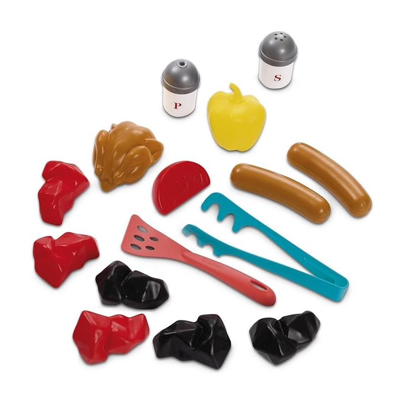 Un barbecue version grise roulant avec plein d'accessoires: 6 morceaux de charbon, une grille, une salière, une poivrière, une pince, une spatule, 2 saucisses, 1 tomate, 1 poivron et 1 poulet. Conseillé dès 18 mois. Origine France Garantie.