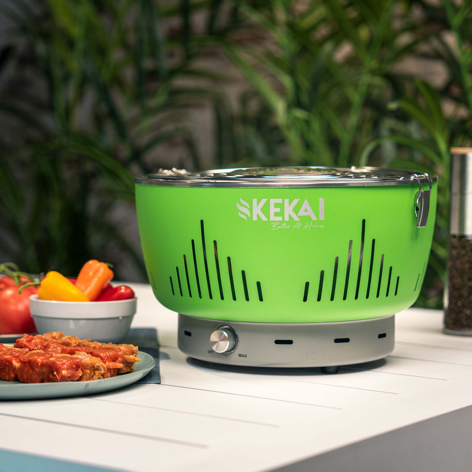 | Libellé | Barbecue de Table Portable au Charbon Kekai Crater 35x35x25 cm Vert Cuve Récupération Graisses Ventilateur Réglable |