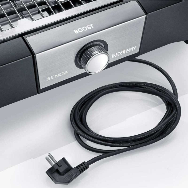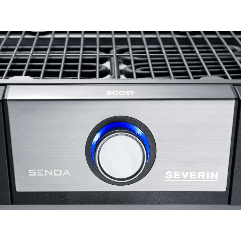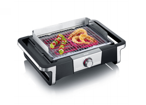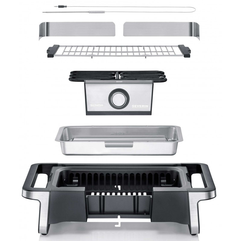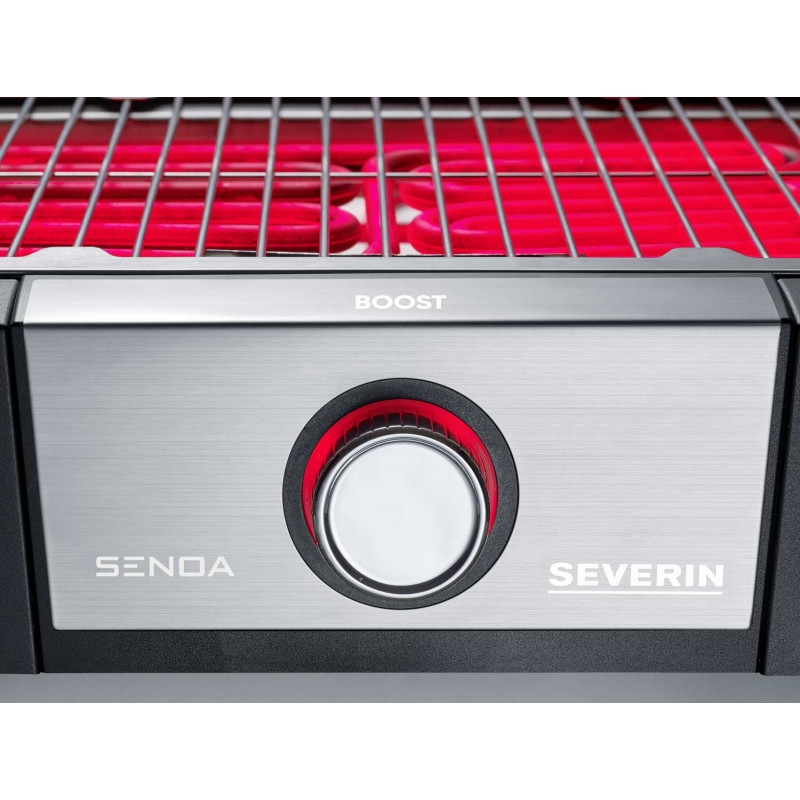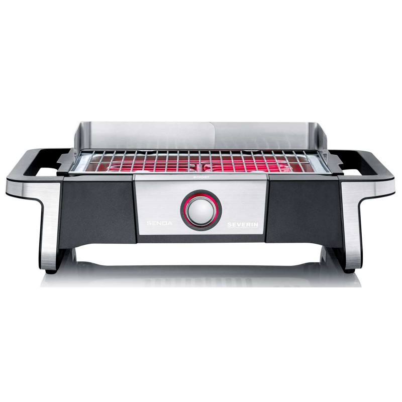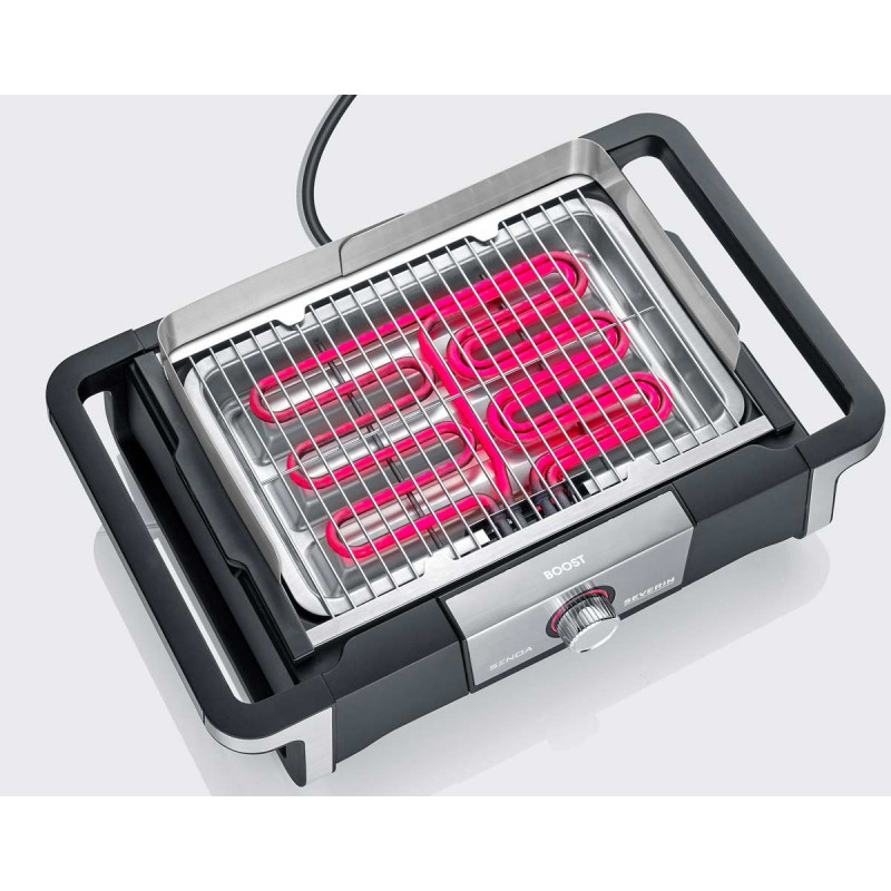 pg8113 - barbecue électrique posable 3000w - Barbecue électrique posable Boost Severin PG8113 dotée d'une grille inox de haute qualité et cuve avec réflecteur de chaleur, pour une cuisson encore plus rapide. BoostZone : zone double avec résistance hautement efficace pour une puissance maximale de 500° C. Thermostat réglable de 0 à 500° C en seulement 10 minutes. Bouton rotatif réglable avec rétro-éclairage LED 360° C. Moins de fumée et moins d'odeurs grâce au bac à eau, parfait pour une utilisation à l'extérieur comme à l'intérieur. Corps à revêtement SafeTouch : ne conduit pas la chaleur pour éviter tous risques de brûlures. Grille et résistance amovibles pour un nettoyage facile. Poignée de chaque côté de l'appareil pour des déplacements simplifiés.