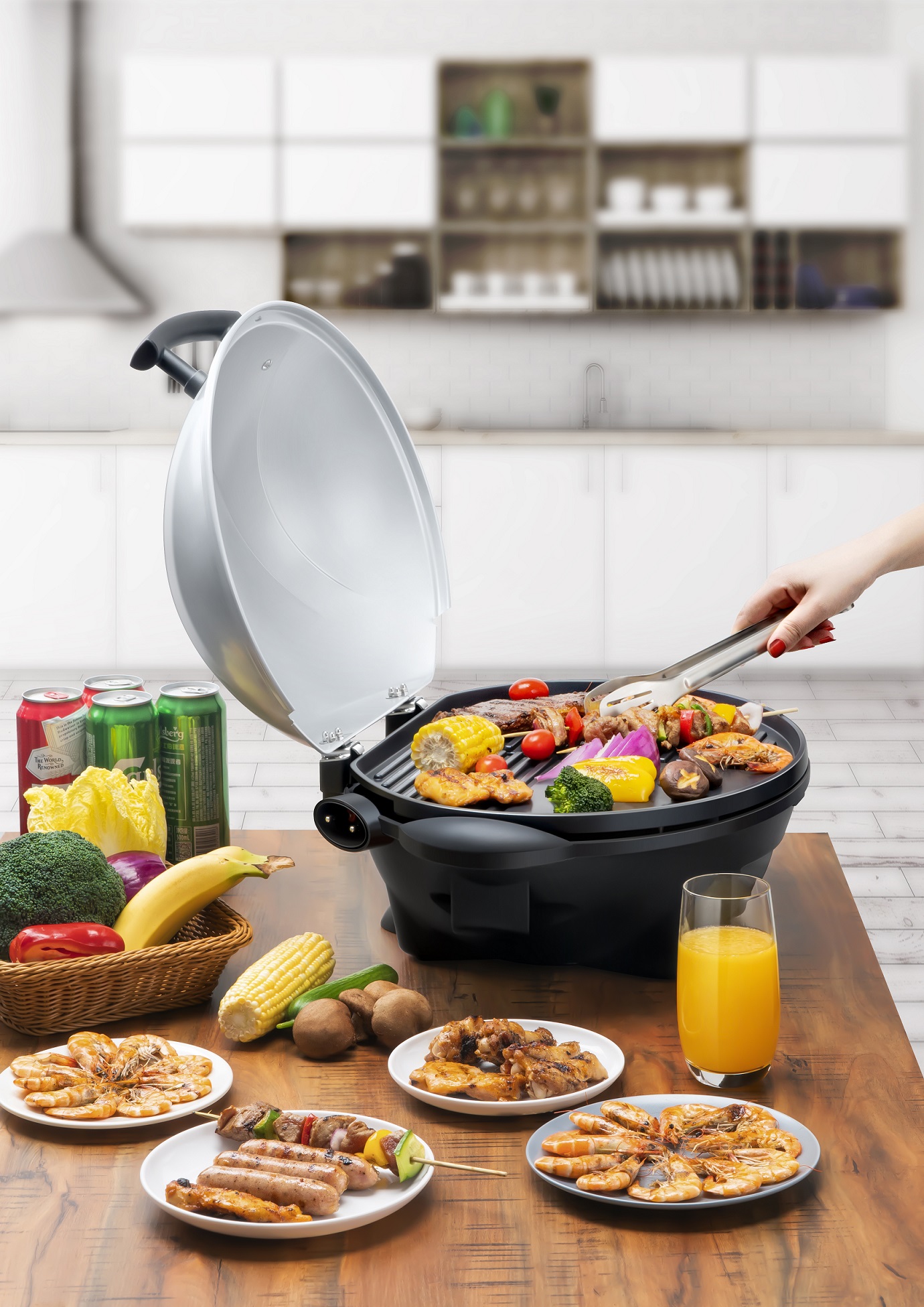 Profitez d'une cuisine conviviale en extérieur ou en intérieur avec vos amis ou votre famille! Ce barbecue est doté d'un couvercle à position double. Lorsque vous êtes en extérieur, il fait office de pare-vent afin d'obtenir une cuisson optimale mais aussi de protéger votre préparation. En plus, votre cuisson n'en sera que plus rapide et permettra une cuisson plus homogène de vos divers aliments gràce à son effet "chaleur tournante".