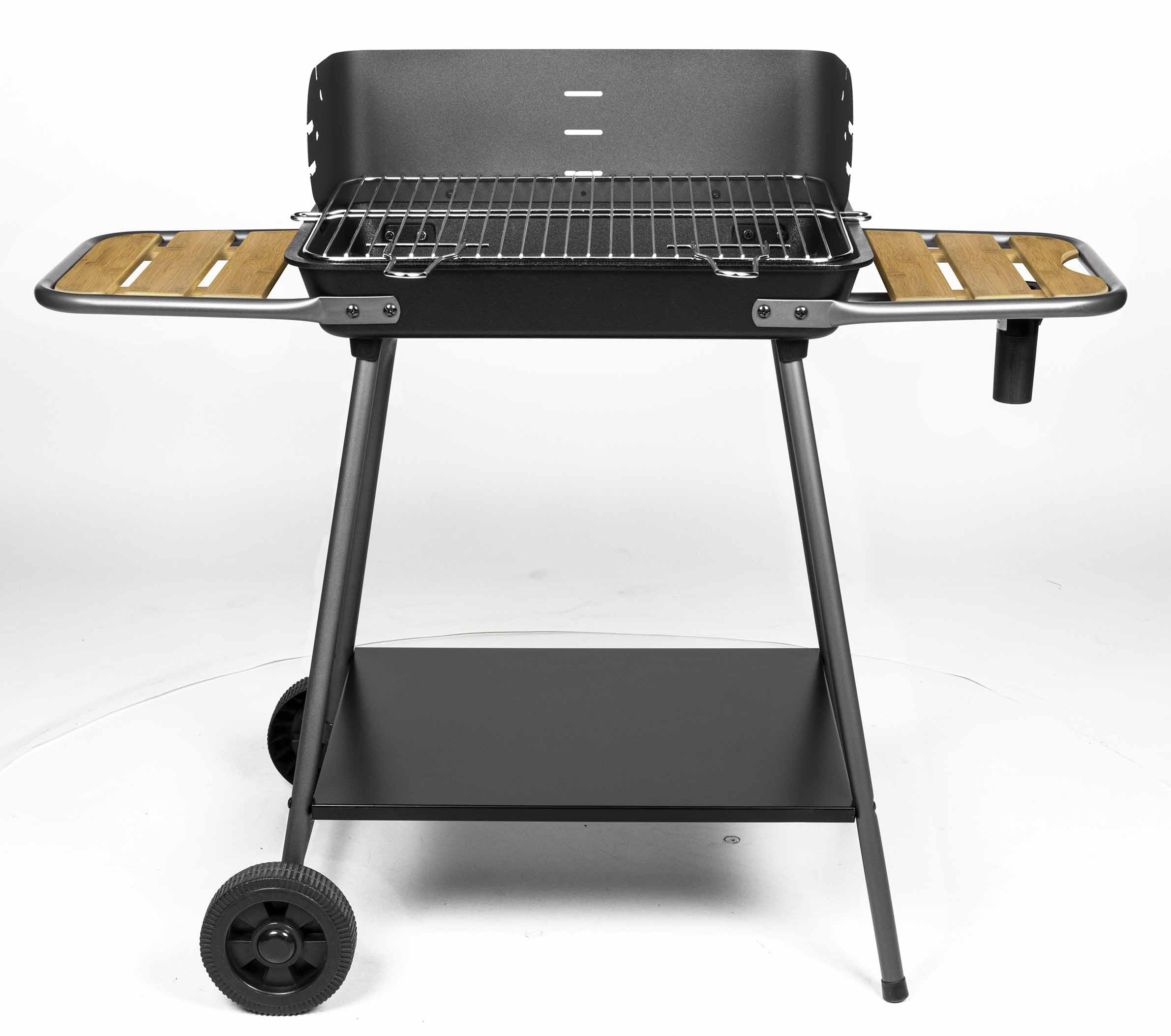 Barbecue charbon de bois cuve fonte 54,5 x 38,5 cm. Grille 51 x 37,2 cm. Soufflerie intégrée TURBOMAGIC. Sur chariot avec tablettes latérales et plateforme de rangement. Fabrication Française.