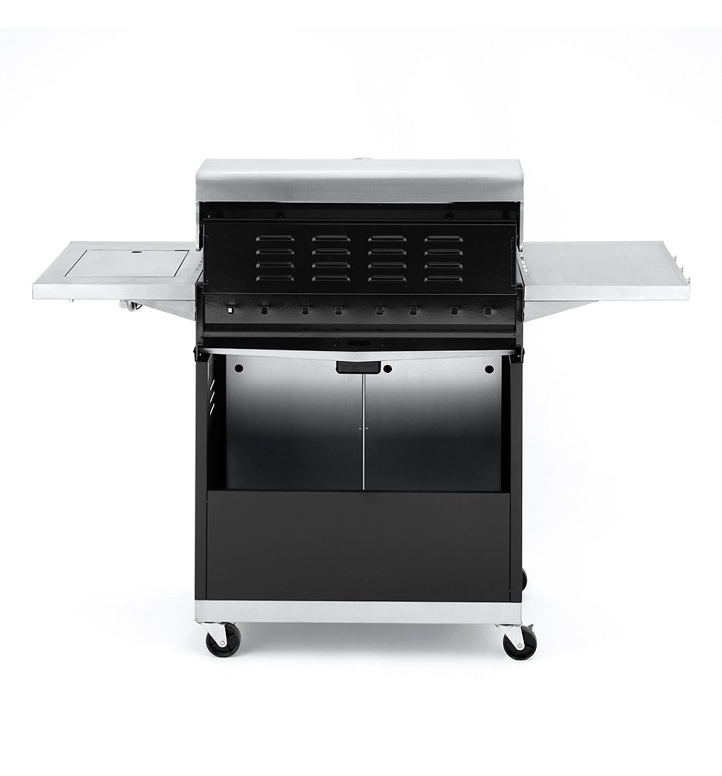 Barbecue tout inox. 4 feux dont une partie en grill. Le couvercle ( capot) permet une cuisson à cœur et de plus permet de réduire l'apport de gaz.