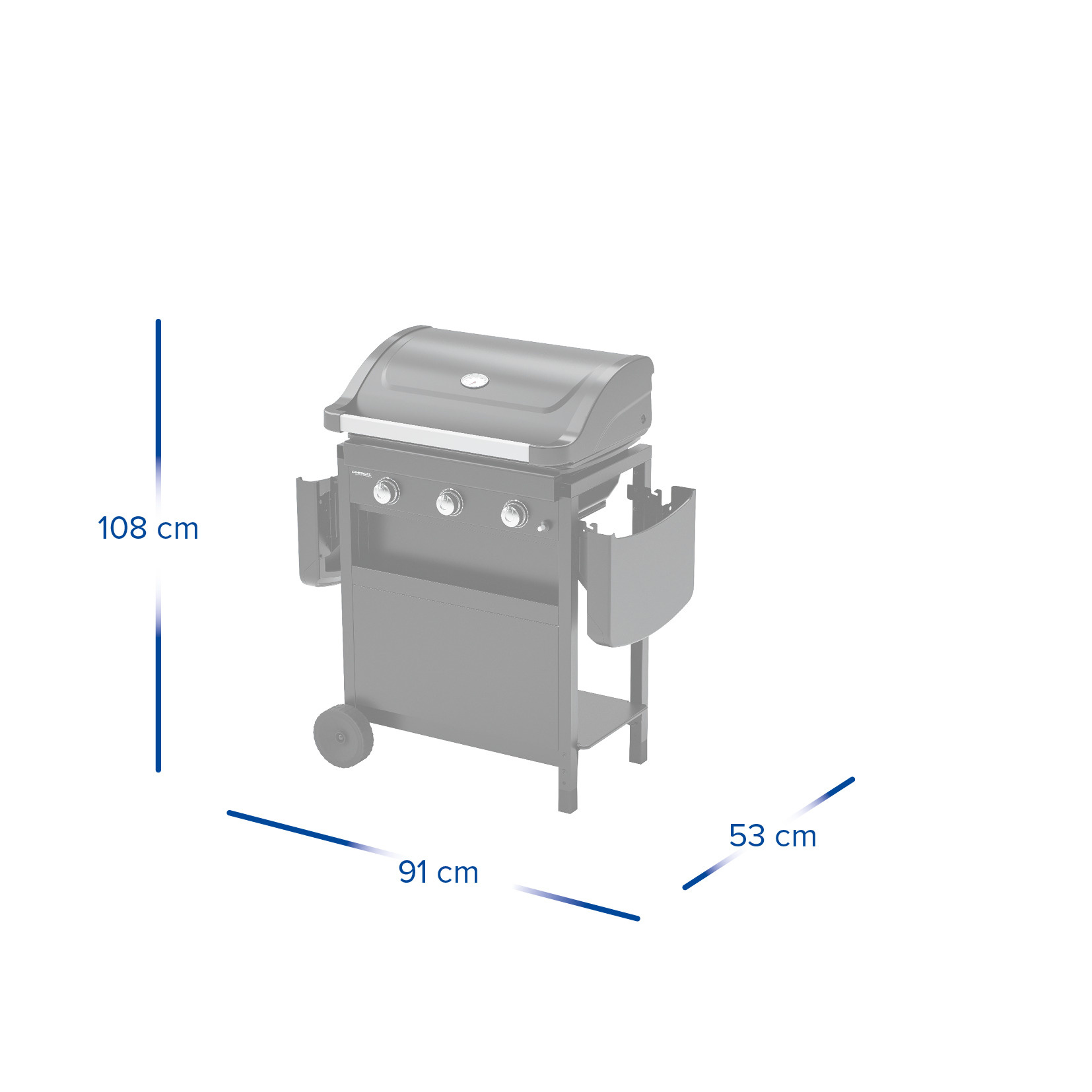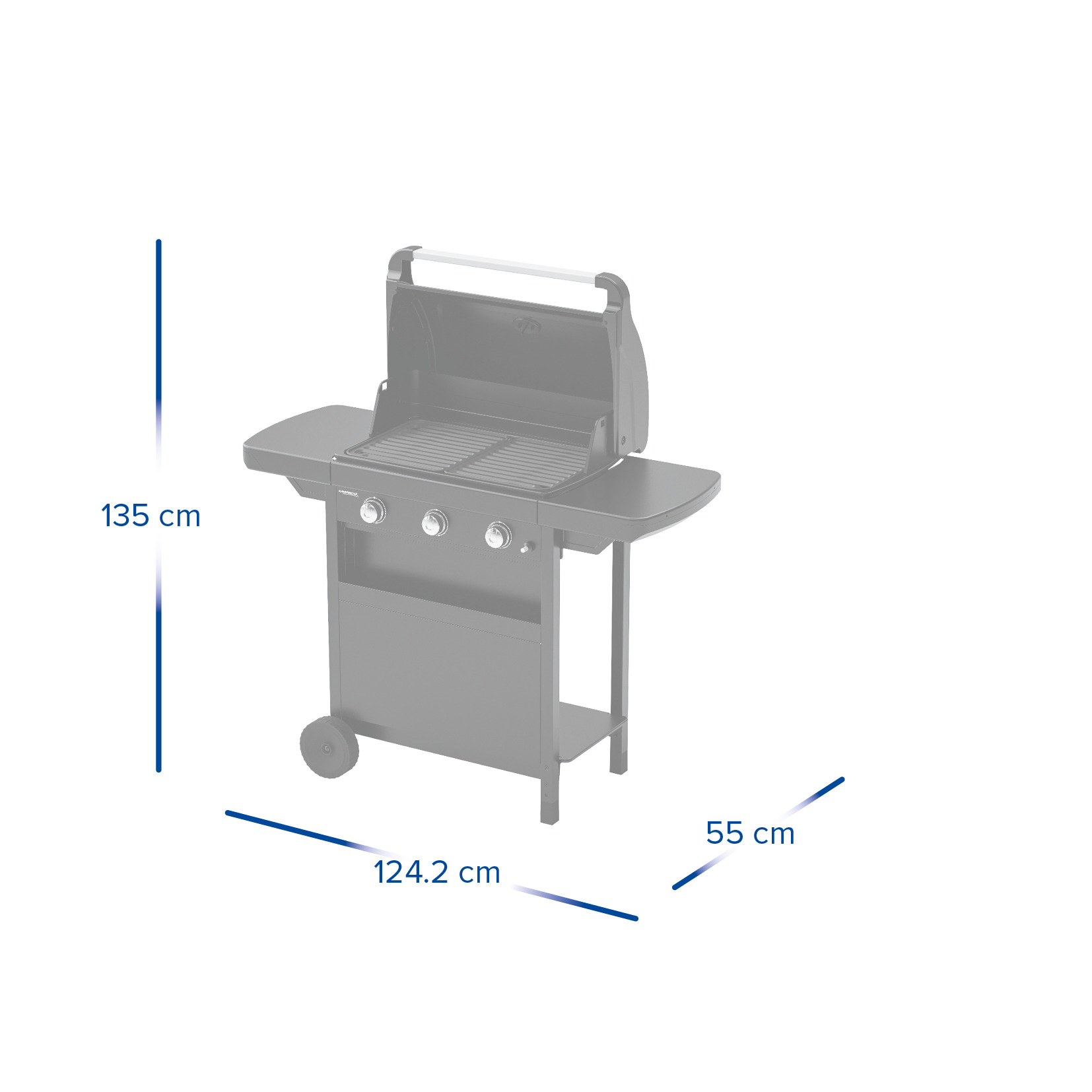 Modes de cuisson : Grille / Four Grille en acier émaillé Surface de cuisson : L 60 x P 35 cm Protection des brûleurs pour éviter les flammes soudaines 3 brûleurs en acier aluminié Puissance totale : 7,5 kW Allumage piezo Couvercle avec thermomètre pour la cuisson four Barquette amovible de récupération des graisses sous la cuve Chariot en acier avec panneau frontal et panier à épices intégré 2 tablettes latérales rabattables Dimensions : L 124 x P 55 x H 109 cm (couvercle fermé, tablettes dépliées) Poids : 27 kg