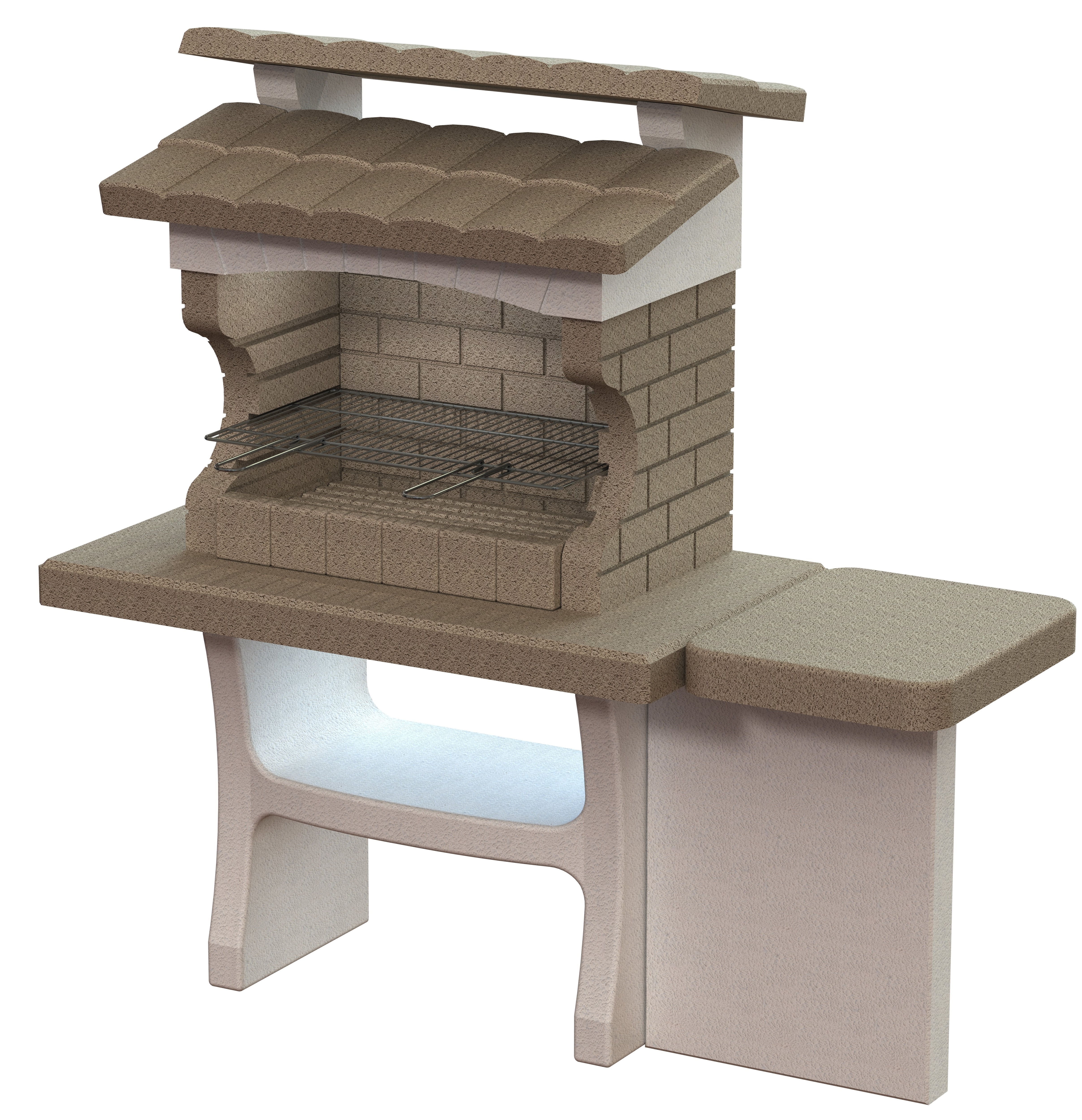 Barbecue fixe en béton avec table latérale. Grande surface. Système protection foyer et cuisson saine "safe grill". 4 positions de cuisson. Foyer imitation briquette. Teinté dans la masse
