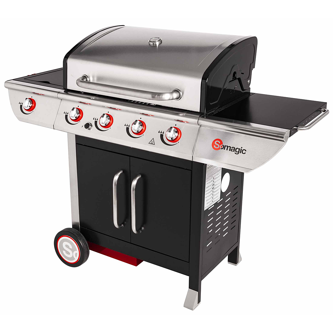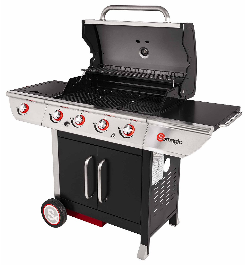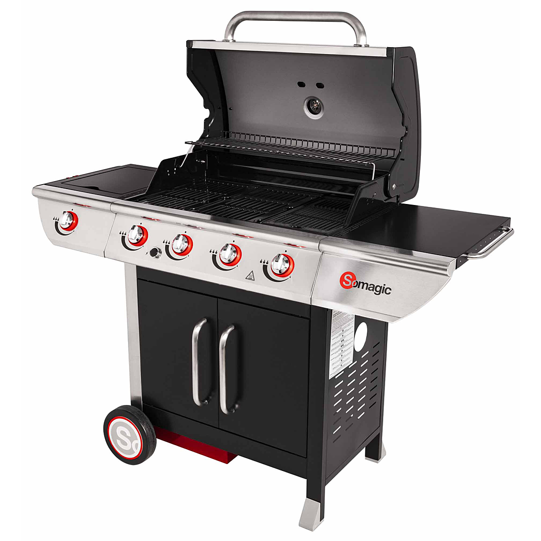 Barbecue Gaz cuve acier émaillé 72 x 44 cm sur chariot avec crochets porte-accessoires. Couvercle et panneau de commande inox. Thermomètre. 3 grilles de cuisson acier émaillé 23 x 43 cm. Grille de réchaud 65 x 20cm. 4 brûleurs indépendants 14kW et un brûleur indépendant 2,3kW. Piezzo. Réchaud latéral 2,3kW. Tiroir Récupérateur de graisse.