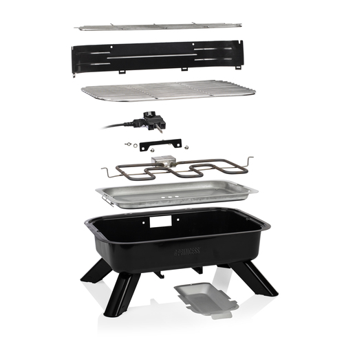 - La livraison comprend 2 grilles de grill, 1 pare-vent, 1 bac à charbon, 1 bac à graisse et 1 élément chauffant amovible