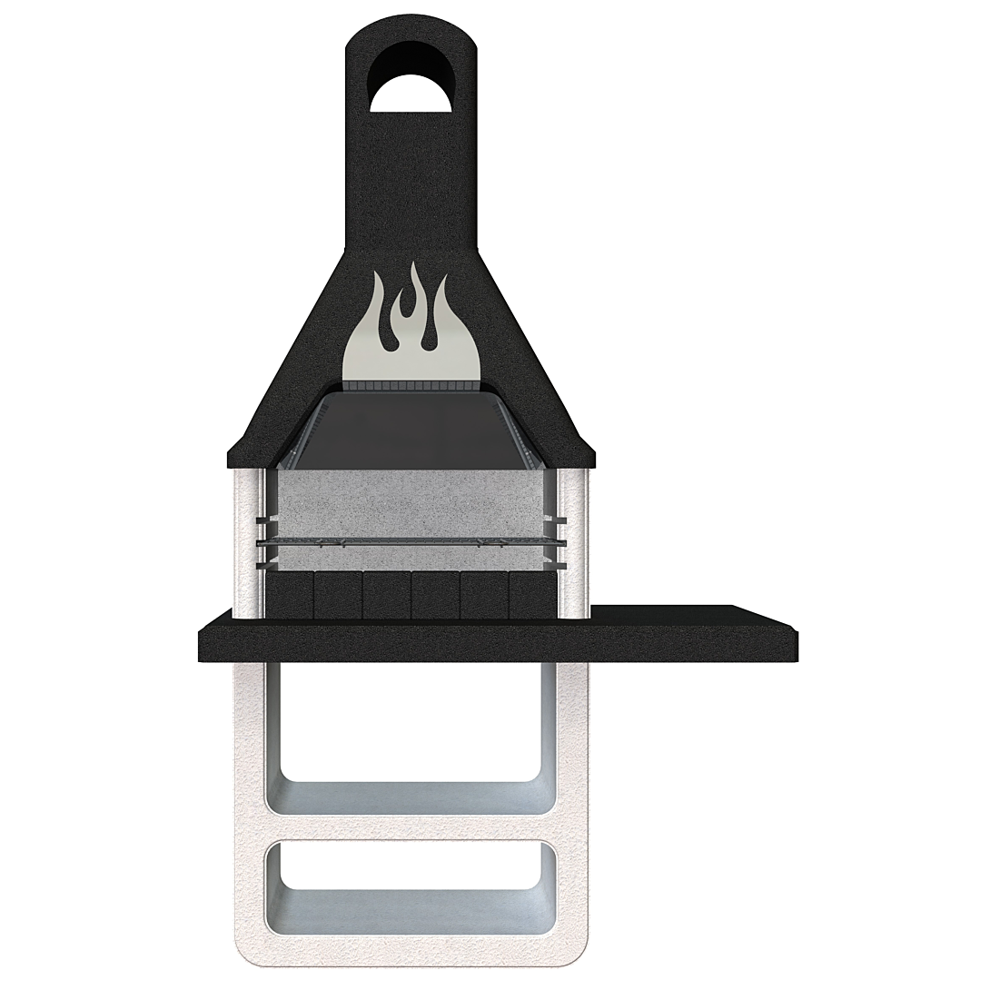 Barbecue en béton allégé. Décor flamme protègehotte amovible et lavable en acier inox. Équipé de contre hotte en métal pour l’emploi du bois. Foyer avec grille de cuisson chromée réglable sur 3 hauteurs. Base avec étagère pratique. Plan de travail et SAFE GRILL .Teintés dans la masse, le reste est à personnaliser avec le crèpi au quartz Sarom. Montage facile.