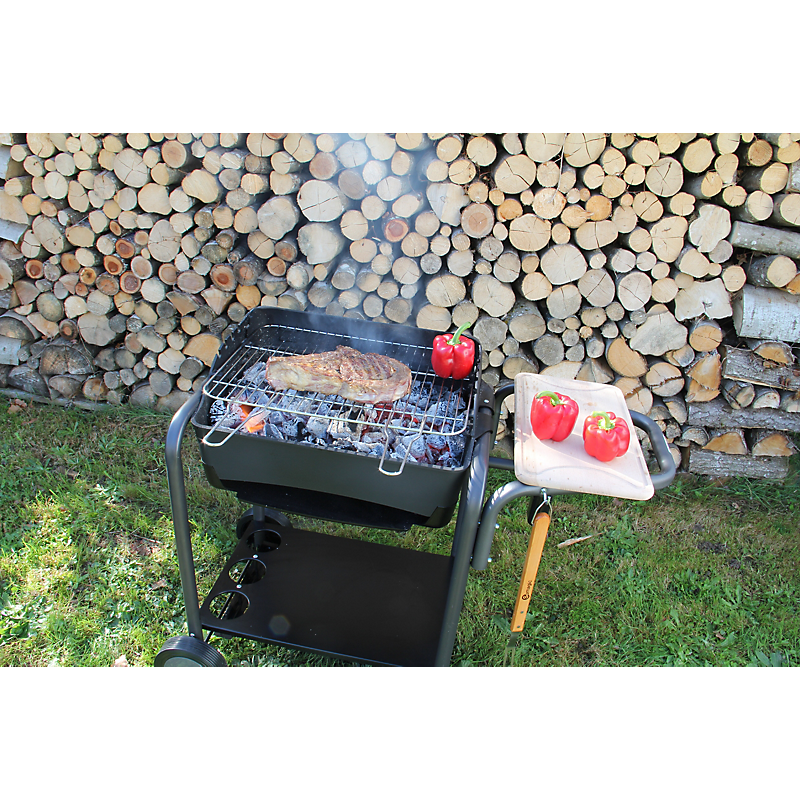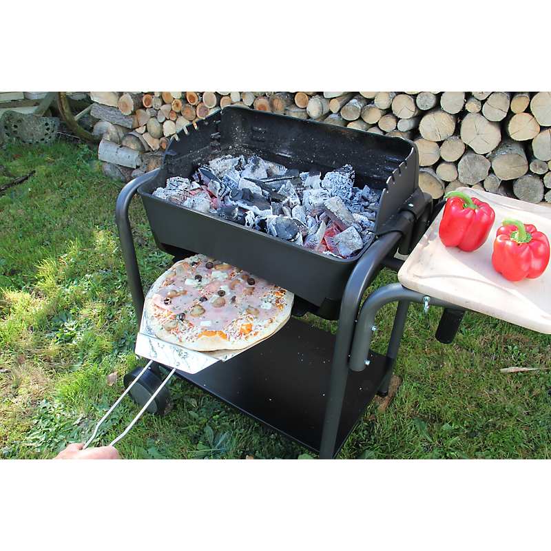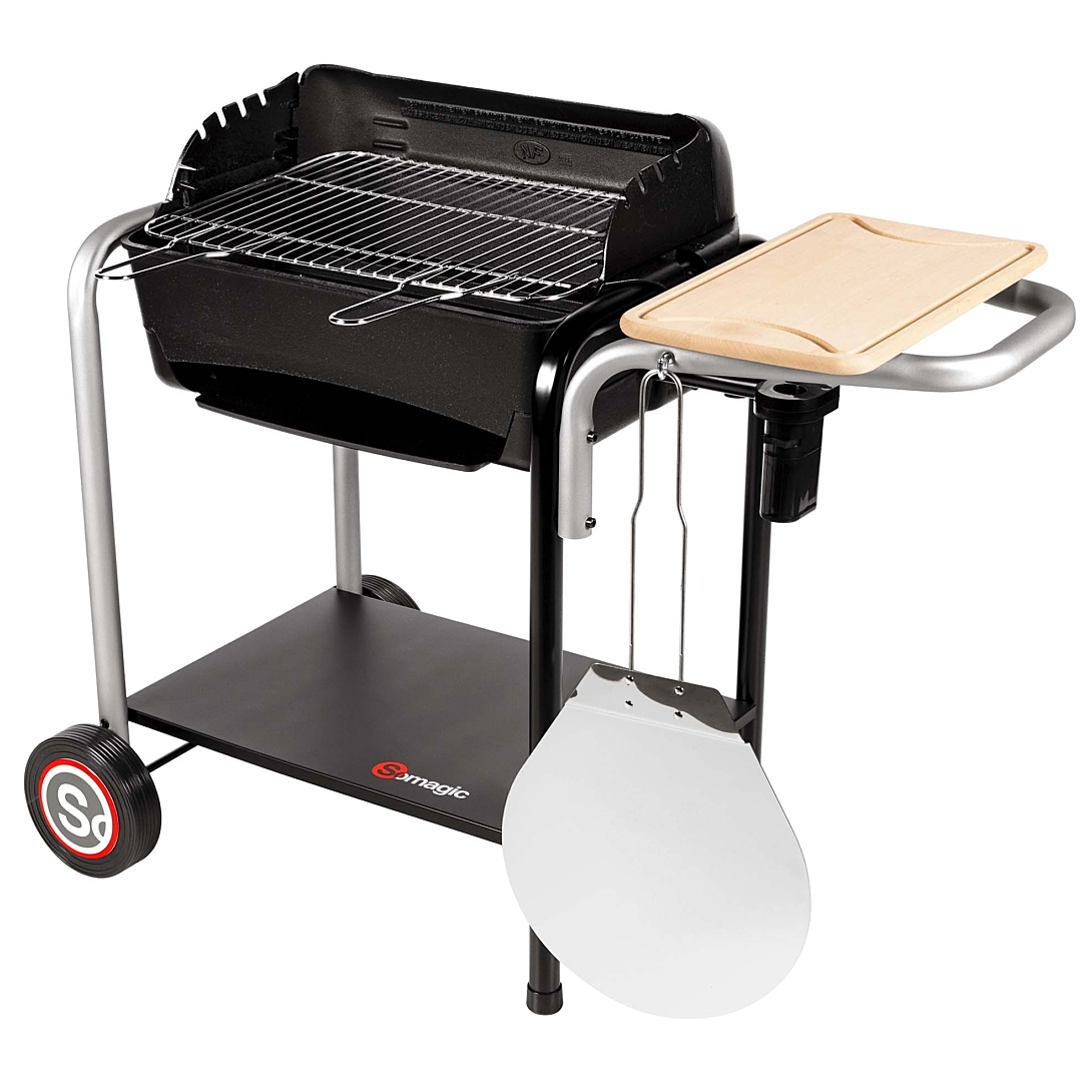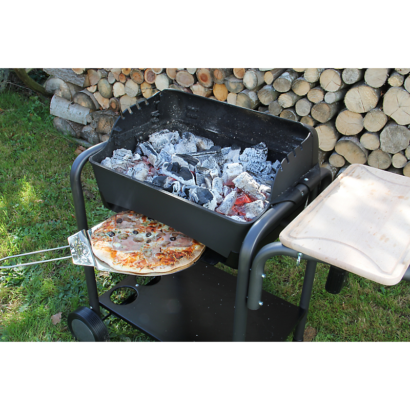 Barbecue rect. Cuve fonte 62x43 cm et parevent fonte grille de cuisson acier chromé 51,4x37 cm sur grand chariot à roulettes, planche à decouper et large plateforme de rangement avec four ouvert intégré. Livré avec pelle à pizza et grille verticale Système de soufflerie TURBOMAGIC pour allumage facile fabrication française