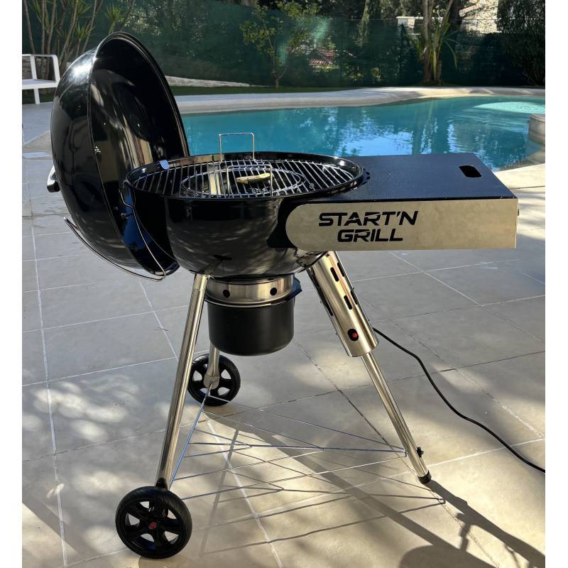 Barbecue Start N Grill à allumage facile, rapide et automatique au charbon de bois en 90s grâce à son système brevetée.Idéal pour 8 à 10 personnes. INNOVATION UNIQUE & BREVETÉENotre technologie Start'N'Grill appliquée à un barbecue au charbon de bois le rend aussi facile à allumer qu'un barbecue électrique ou au gaz. Les utilisateurs profitent du confort d'allumage si simple de ces modes de cuisson sans sacrifier les qualités du véritable barbecue traditionnel qui ne peut selon nous être qu'au charbon de bois avec ses saveurs authentiques et sa convivialité inégalée. PROFITEZ D'UNE CUISSON SAINE & ÉCONOMIQUE& BREVETÉEL'allumage se fait par un simple apport d'air chaud directement sur le charbon à l'entrée de la cuve en acier. Il n'y a donc plus besoin d'apporter des liquides, cubes, petit bois, papier journal ou autres produits allume-feu. En 90secondes, profitez de belles braises ! PRATIQUE & ERGONOMIQUELe Start N Grill est équipé de :✔ Une grande tablette sur le côté de la cuve afin de vous permettre de poser tous vos plats et aliments✔ 4 boutons porte-ustensiles✔ Un décapsuleur magnétique✔ 2 roues afin de le déplacer facilement✔ Aération ajustable d'un doigt✔ Une grille idéale pour 8 à 10 convivesLe Barbecue est en plus, compatible avec tous les accessoires conçus pour les barbecues ronds de diamètre 57cm Caractéristiques :Matériau des pieds : Acier InoxydableMatériau des grilles : Cuisson - Acier inoxydable 4mm / Charbon acier Chromé 5mmMatériau de la cuve : Acier émailléMatériau du plan de travail : Acier peinture vermiculée résistanteDimensions : H112 x L90 x P60 Diamètre de la cuve : 57cmCouleur du barbecue : noirModèle : SNG-0001 avec fonction VortexAlimentation : Électrique, 200-240V~, 50/60HzPuissance : 2000 W / 650°CNombre de pieds : 3Poids : 20Kg Le colis comprend :1* Barbecue Start N grill et ses accessoires 1* Notice d'installation en français Garantie 2 ans