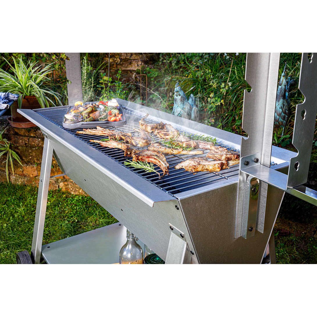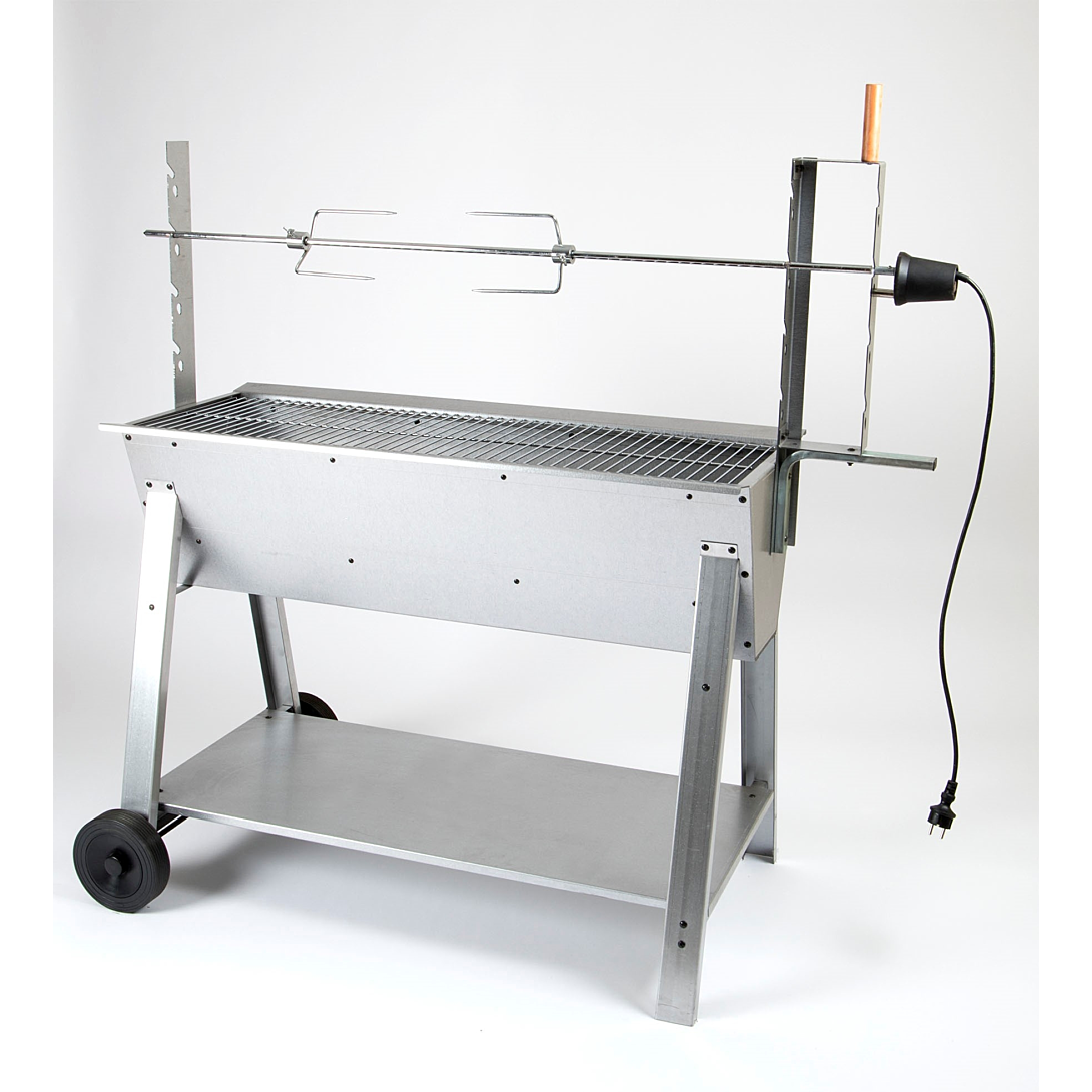 barbecue et rôtisserie cuve acier galvanisé 106x47 cm livré avec grille de cuisson acier 101,5x 34 cm .pour cuisson broche livré avec broche Longueur 127 cm ( longueur utile env 106 cm) avec distance de broche réglable, utilisation avec charbon de bois et/ ou buchettes et moteur électrique sur chariot Fabrication Française