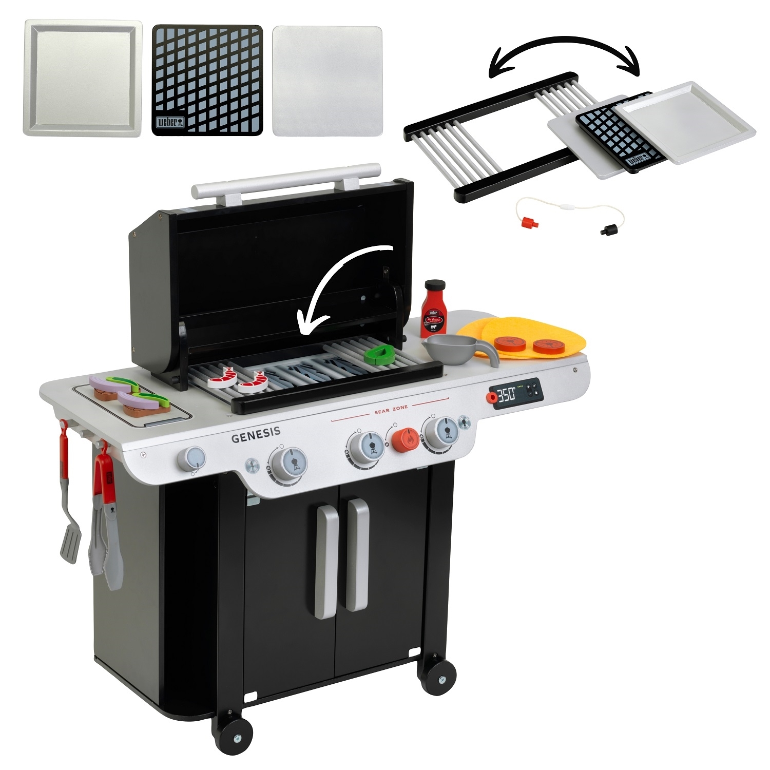 Theo Klein 9445 Barbecue Weber Genesis en bois (MDF) - - Ce barbecue sympa au design Weber est accompagné de nombreux accessoires : une pince à griller, une spatule, un pinceau à barbecue, une sauce et un récipient à sauce adapté, une grille de cuisson et trois inserts à griller (pour steak, pizza et légumes). Pour que les petits fans de barbecue puissent également faire des grillades, deux tacos, deux crevettes, deux jalapeños, deux oignons, deux tomates, deux avocats et deux steaks sont également inclus. Les steaks sont dotés d'une ouverture dans laquelle s'insère le capteur de câble de température (factice) inclus dans la livraison. - - - Dimensions: 74 cm x 32,8 cm x 59,7 cm - À partir de 3 ans