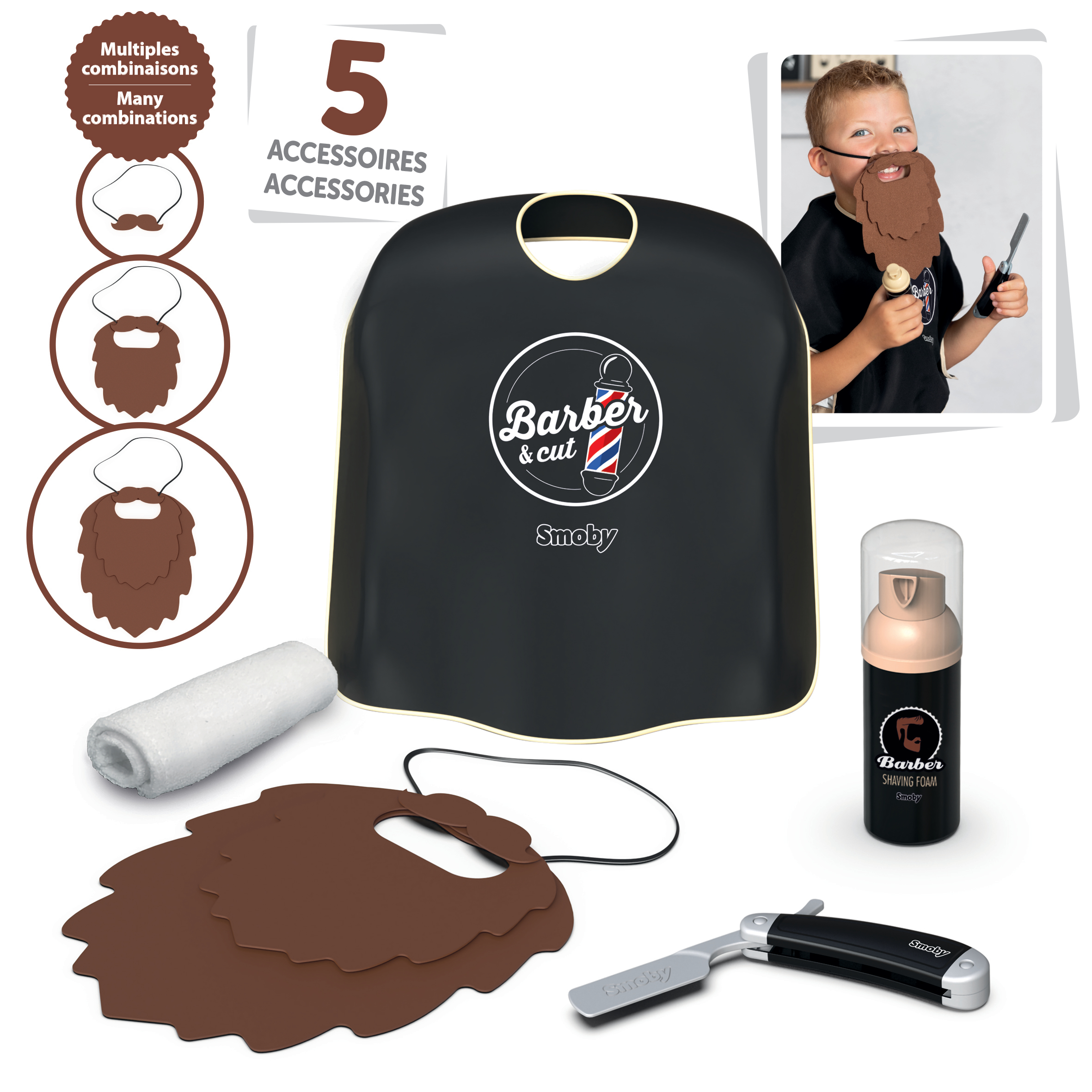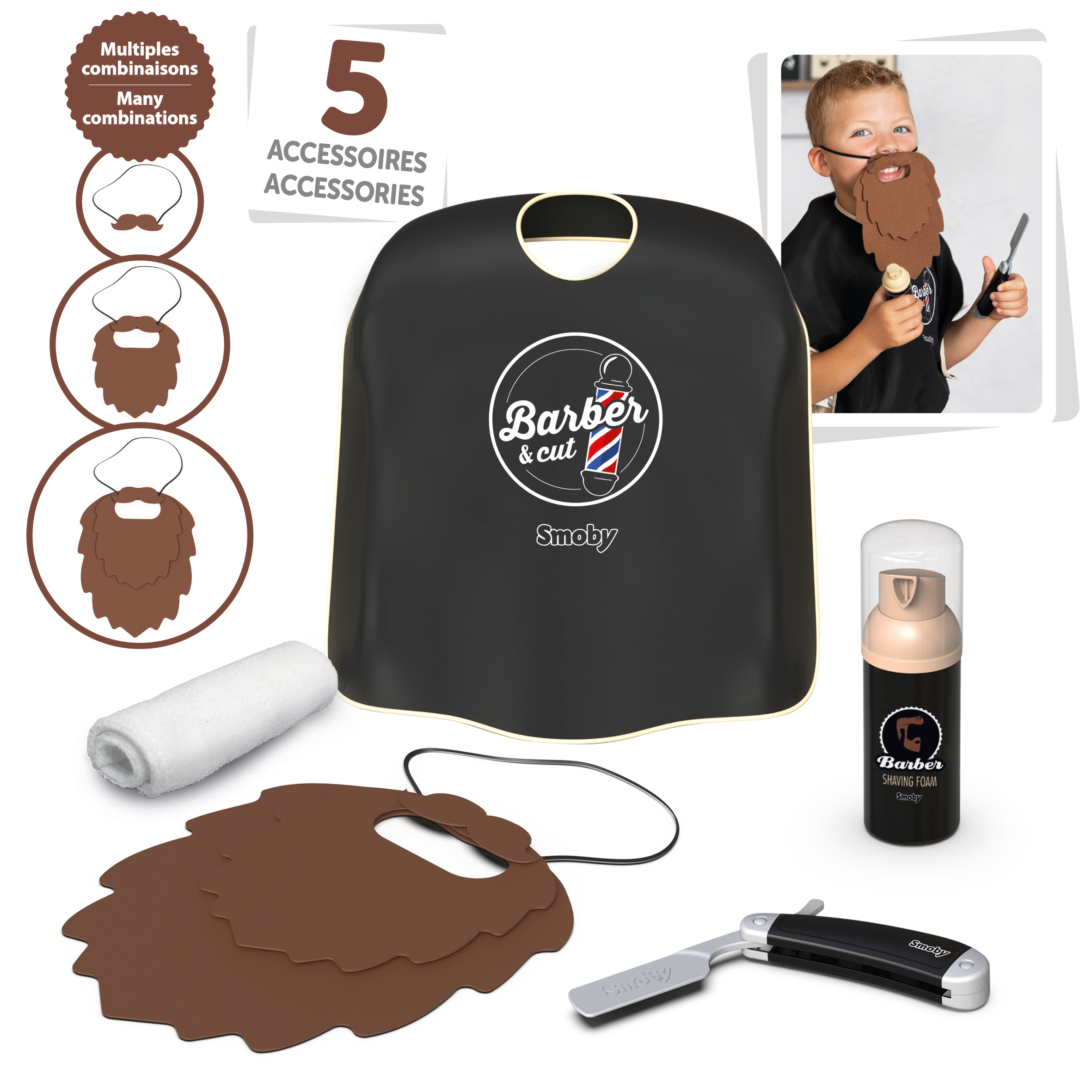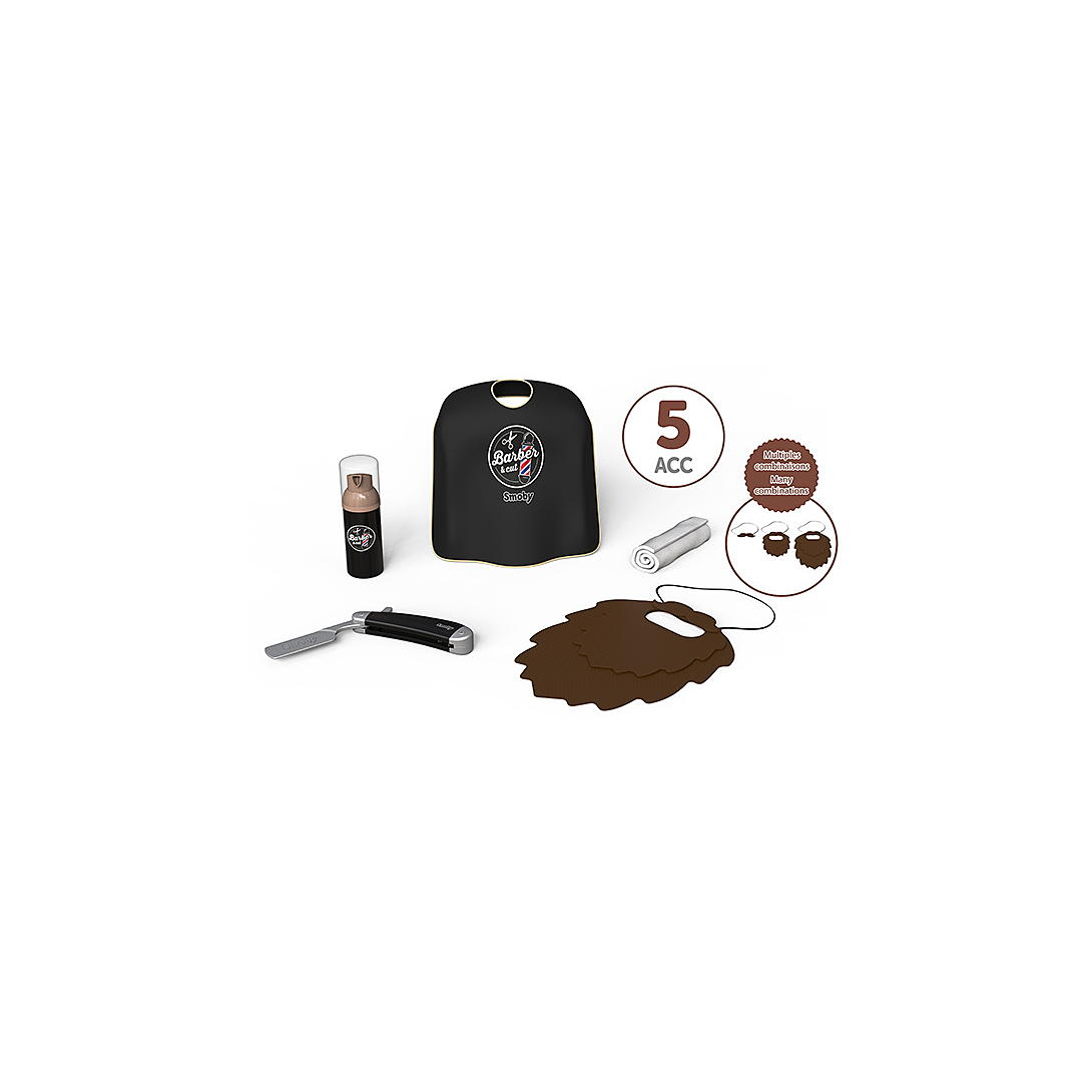 Set barbier composé de 5 accessoires dont: une barbe en feutrine multi-couches avec des scratch permettant d'obtenir différentes formes et longueurs, une cape en tissus, un coupe chou, un flacon de mousse à raser factice et d'une serviette.