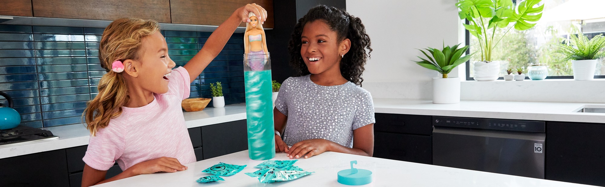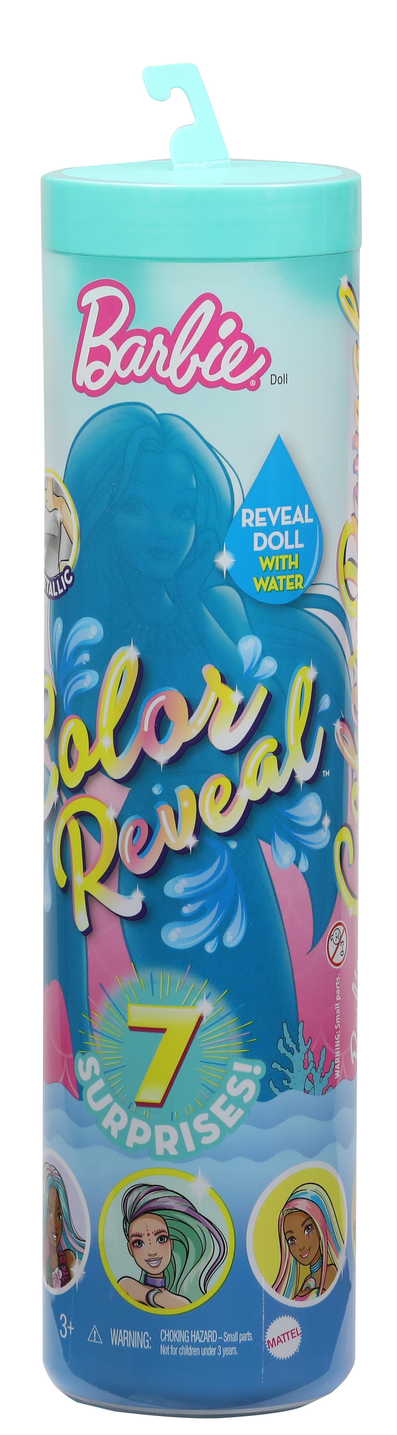 Plus produit Avec 7 surprises dans une boîte, les poupées Barbie Color Reveal enchanteront les enfants qui plongeront dans des aventures merveilleuses avec cette série de sirènes ! § Commencez par enlever la pellicule opaque qui cache ce quil y a dans le tube, puis dévissez le couvercle et sortez la poupée entièrement recouverte de peinture turquoise métallisée Color Reveal et accompagnée de 4 sachets décorés au contenu mystérieux ! § Remplissez le tube deau chaude, plongez la poupée dedans et faites-la tourner jusquà ce que leau prenne la couleur de la poupée : magique ! § Sortez alors la poupée pour découvrir la couleur de ses yeux, de ses cheveux aux longues mèches colorées et de sa peau, ainsi que de son justaucorps décoré. § Ouvrez les 4 sachets mystères pour découvrir une queue de sirène métallisée, un collier, une brosse et une petite éponge. Vous pourrez les ranger ensuite dans le tube. § Trempez léponge dans leau glacée et passez-la sur le visage et les cheveux de Barbie pour voir des mèches changer de couleur et un maquillage décoratif apparaître. Et rien ne vous empêche de recommencer ce tour de magie à linfini ! § Fixez la queue de sirène et agrémentez la tenue de la poupée daccessoires pour la voir se transformer sous vos yeux, sans oublier les changements de couleur magiques ! § Cette Barbie Color Reveal constitue un joli cadeau pour les enfants de 3 à 7 ans, surtout sils aiment les créatures fantastiques. § Collectionnez-les toutes pour mélanger et associer les différents accessoires et élargir les possibilités de jeu !