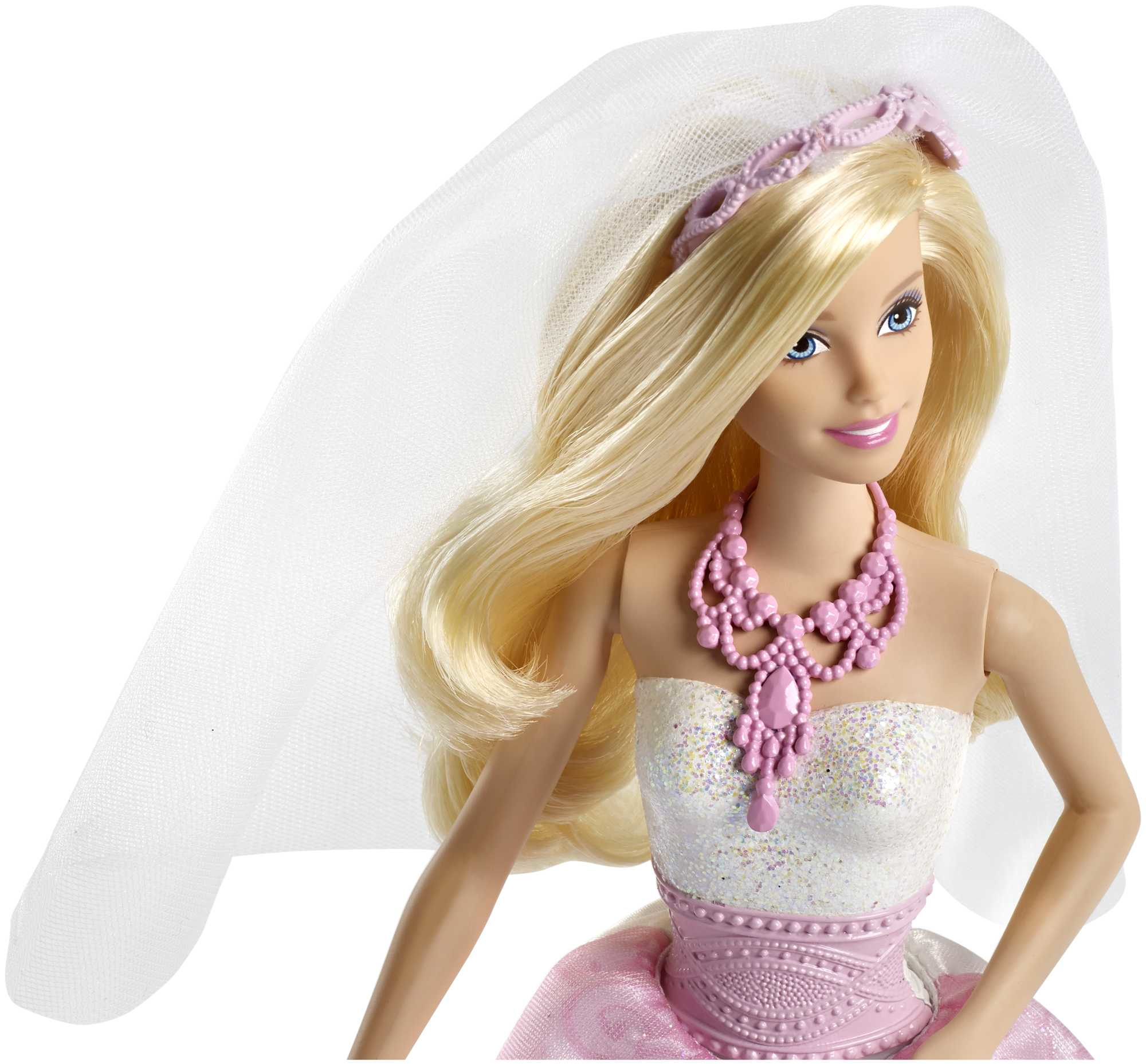 Cette barbie est simple mais magnifique avec sa robe de mariée pailletés et son voile de mariée.Sa chevelure légèrement ondulé la rende splendide.Ma fille l'a tout de suite aimé.