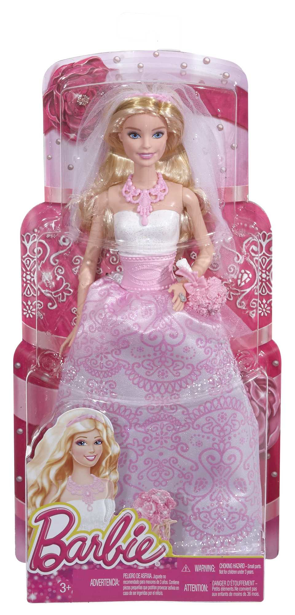 | Plus produit | Recrée des mariages inoubliables et imagine des aventures fantastiques avec cette mariée au look tendance § Dans cette robe unique, Barbie est une mariée moderne à la gracieuse silhouette, ornée de motifs roses brillants. § Un magnifique collier d\'apparat et un serre-tête comportant un voile complètent son bel ensemble de mariée. § Place le bouquet rose dans sa main pour accompagner Barbie à l\'autel et donner libre cours à ton imagination! § |