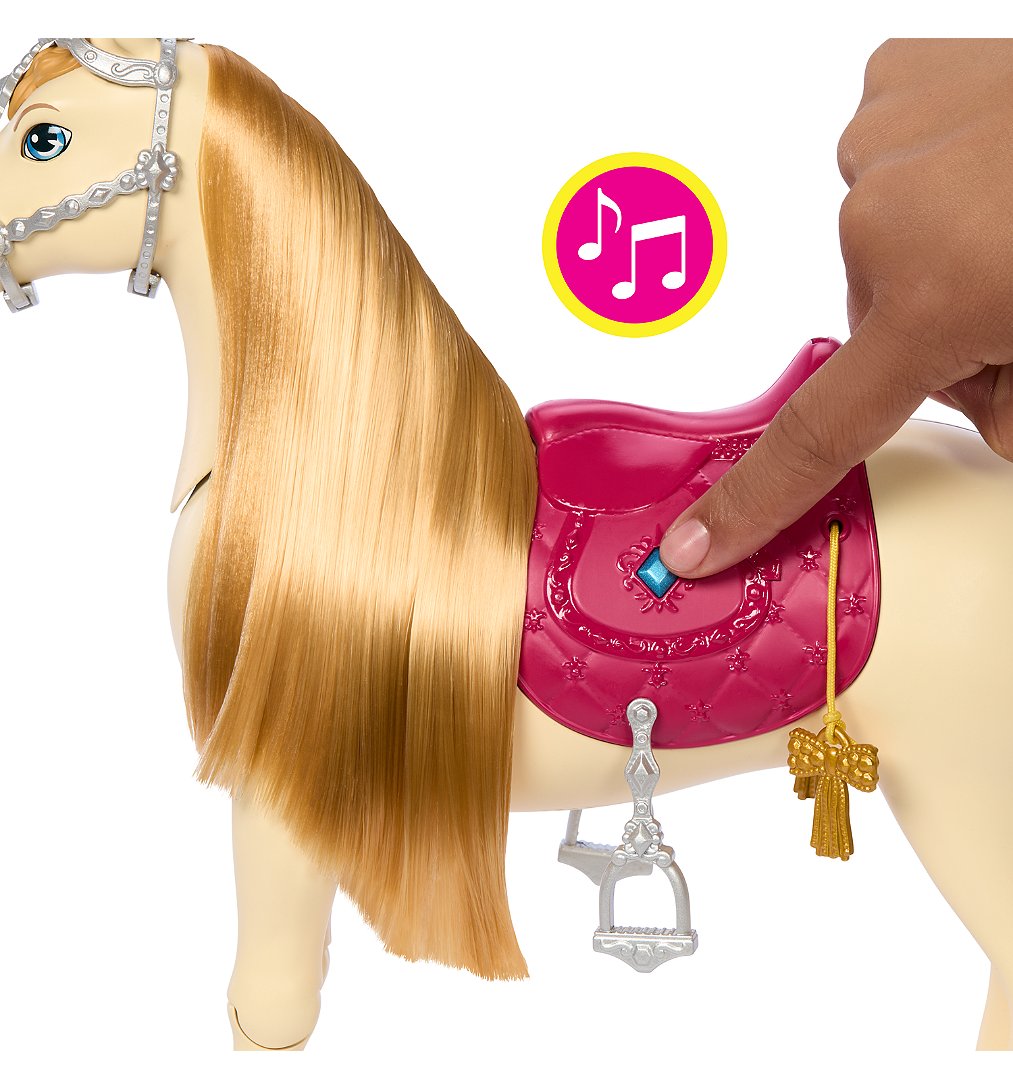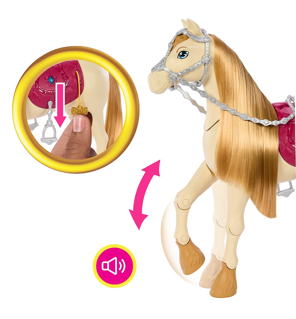 Tornade sort au galop de la série Netflix Barbie Mysteries : The Great Horse Chase pour devenir une figurine de cheval interactive avec plus de 20 sons et offrant de nombreuses façons de jouer : des soins aux compétitions en passant par la coiffure. Ce cheval de Barbie danse, cligne des yeux, joue des chansons inspirées de la série, et produit des sons amusants comme des hennissements, des bruits de mastication et des galops, entre autres. Des accessoires comme un trophée, de la nourriture, une brosse et une corbeille à repas stimulent l’imagination avec Barbie et son nouvel ami Tornade ! Les couleurs et les décorations peuvent varier.