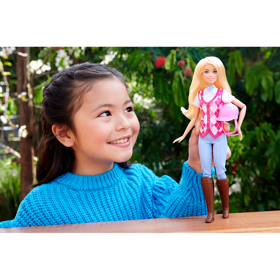 La poupée Barbie « Malibu » est prête pour des aventures équestres ! Avec son élégante tenue d’équitation, elle ressemble à son personnage de la série Netflix, Barbie Mysteries : The Great Horse Chase. La poupée porte une chemise et un gilet amovibles, un pantalon, des bottes et une bombe. Elle est articulée au niveau des coudes, des poignets et des genoux pour un jeu d’équitation réaliste ! La poupée ne tient pas debout toute seule. Les couleurs et les décorations peuvent varier.