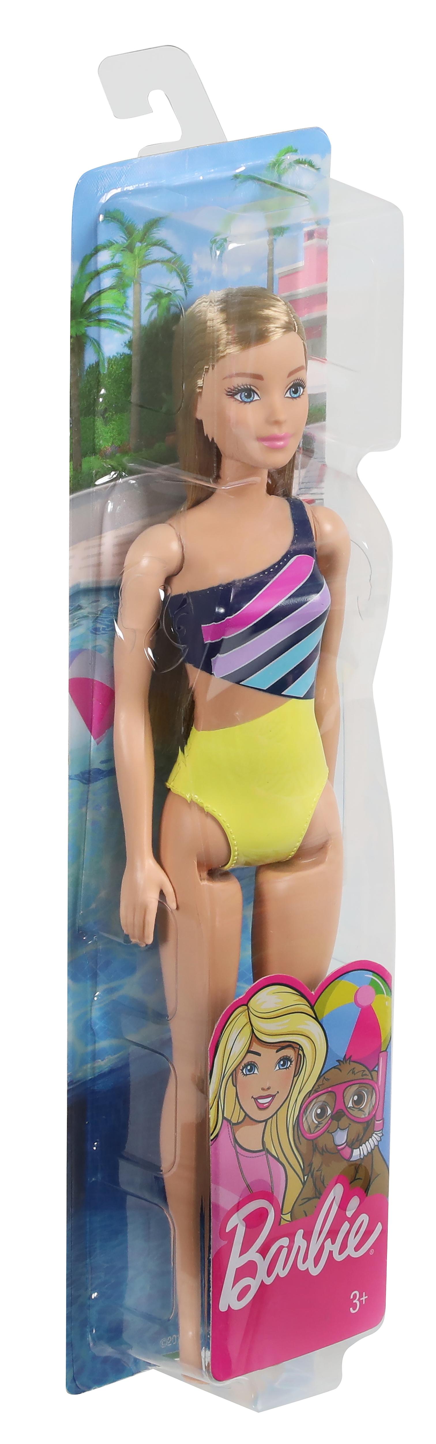 | Plus produit | Tout le monde passe une journée à la plage avec cette poupée rayonnante ! § Elle porte un fabuleux maillot une pièce à rayures ! § Les couleurs et le design sont très tendance. § Tu vas adorer imaginer des journées à la plage, des fêtes au bord de la piscine et des vacances d\'été mémorables avec cette adorable poupée châtain. § Collectionne les poupées Barbie Plage (chacune vendue séparément) pour organiser une vraie fête sur la plage ! |
