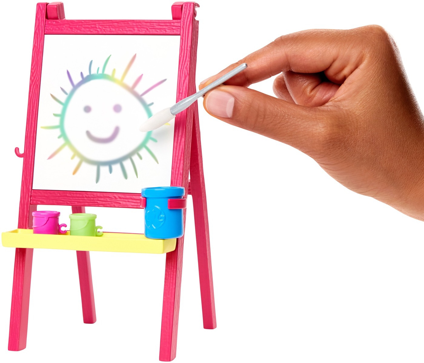 Ce coffret comprend 1 poupée Barbie Professeure dart en leggings, t-shirt, tennis et tablier en jean, 1 poupée enfant élève, un chevalet avec tablette. Trempez le pinceau dans leau, puis peignez la surface blanche du chevalet pour voir votre chef-duvre apparaître ! Essuyez la surface et créez encore et encore ! Les éléments de jeu incluent un chevalet avec une surface pour peindre, des gobelets pour la peinture et leau, une palette, un pinceau et un marchepied pour lenfant.