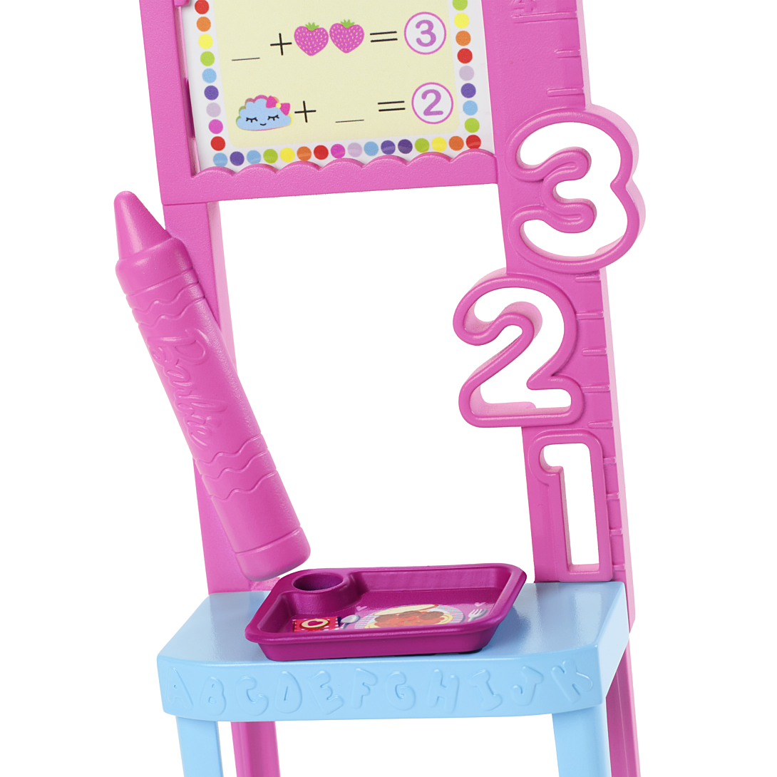 Préparez-vous à acquérir des connaissances avec la poupée Barbie Professeur ! Barbie, vêtue d’une robe imprimée amovible et de chaussures, fait la classe à sa jeune élève. Le coffret inclut des autocollants à placer sur le tableau pour enrichir les histoires ! Avec d’autres accessoires classiques des salles de classe, tels que des ciseaux à bouts ronds, un sac à dos et une chaise pour les tout-petits, les enfants peuvent imaginer tout un monde d’histoires et de carrières possibles. Cette poupée est prête à inspirer les enfants à devenir ce qu’ils veulent ! La poupée ne tient pas debout toute seule. Les couleurs et les décorations peuvent varier.