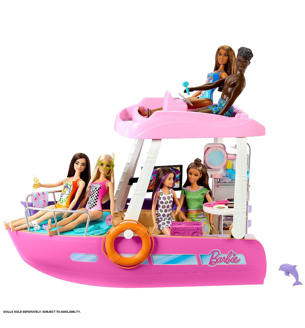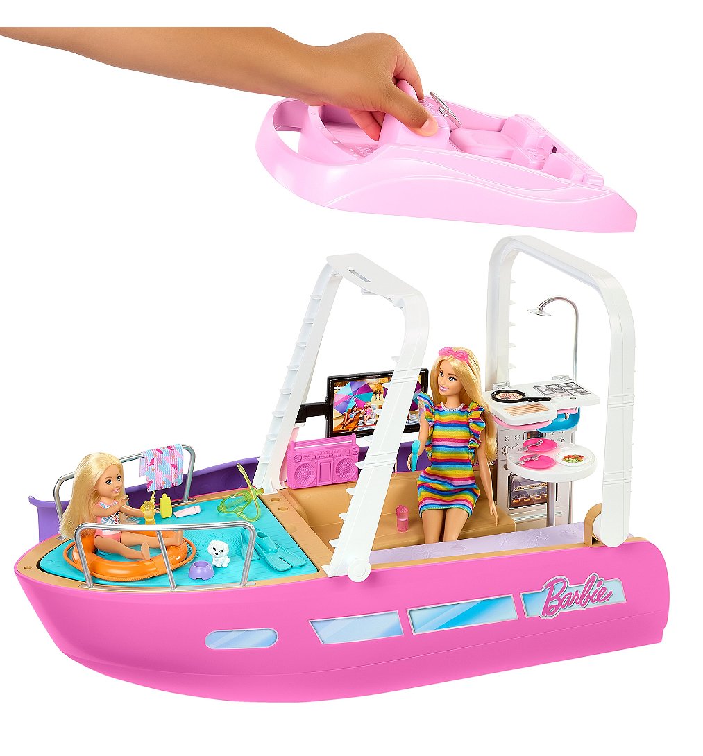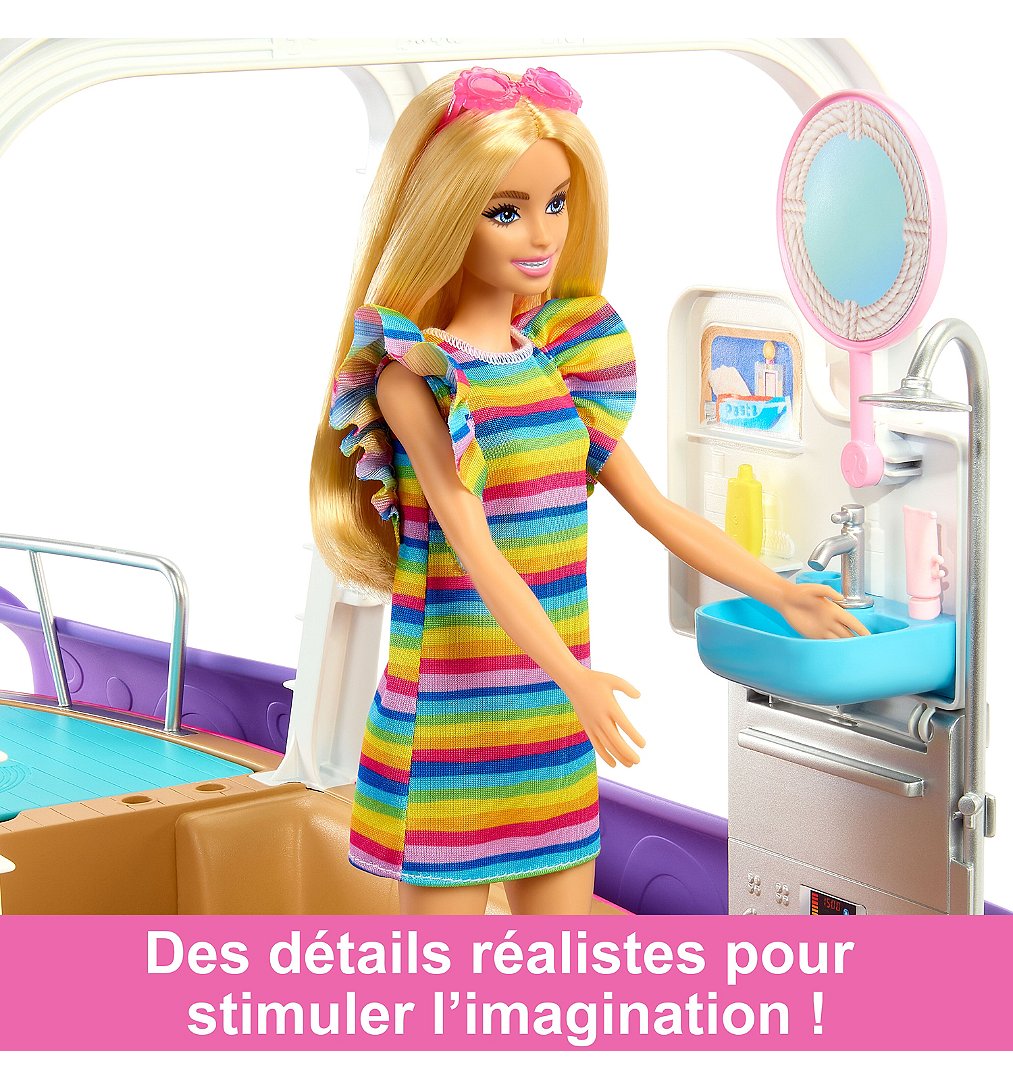 | Plus produit | Laissez libre cours à votre imagination avec le Bateau de Rêve Barbie® ! Ce coffret est rempli de détails haut de gamme, comme une piscine, un toboggan, deux effets de transformation différents, et bien plus encore.\nBarbie® peut sinstaller sur le pont supérieur pour tenir la barre ou se détendre au soleil, puis se laisser glisser dans la piscine ! Les enfants peuvent même retirer le pont supérieur pour accéder plus facilement aux différents éléments de jeu. Poupée non incluse.\nSix espaces de jeu, y compris une salle de bain, un solarium, une piscine avec toboggan, une chambre, une cuisine et un salon. Quelques secondes suffisent pour transformer le salon et la cuisine en chambre et en salle de bain !\nCe bateau Barbie® inclut plus de 20 éléments ! Il y a des accessoires aquatiques, tels que des palmes et un tuba, ainsi que dautres petits objets amusants, comme une caméra sous-marine, de la nourriture, des boissons, et même une enceinte portable.\nUn chiot et un dauphin feront dexcellents compagnons pour explorer les mers avec Barbie® !\nEmbarquez sur le Bateau de Rêve Barbie® pour prendre le large avec style ! Une excellente idée de cadeau pour les enfants à partir de 3 ans. |