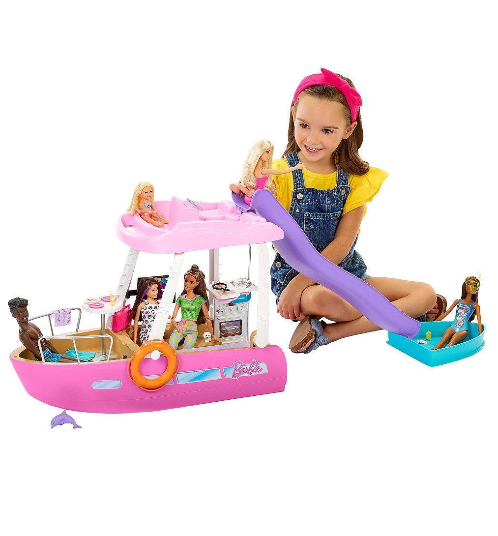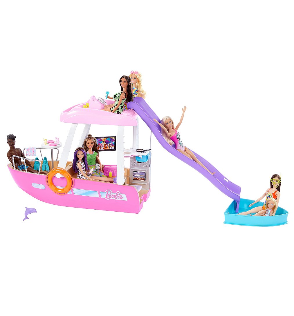 Le grand bateau transformable de Barbie dispose de 7 espaces de jeu, de 20 accessoires, de 3 transformations surprises et d’un toboggan avec une piscine.