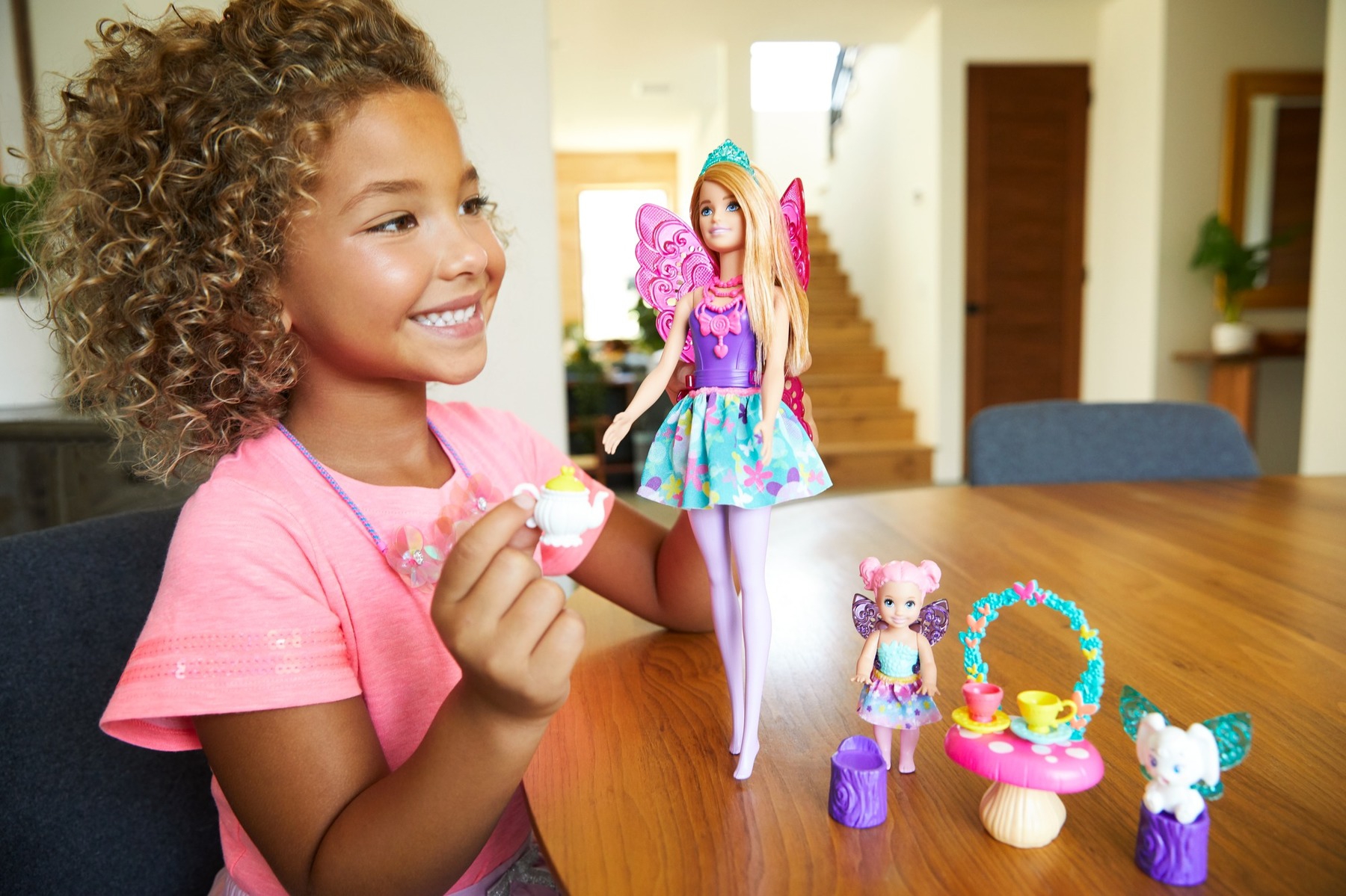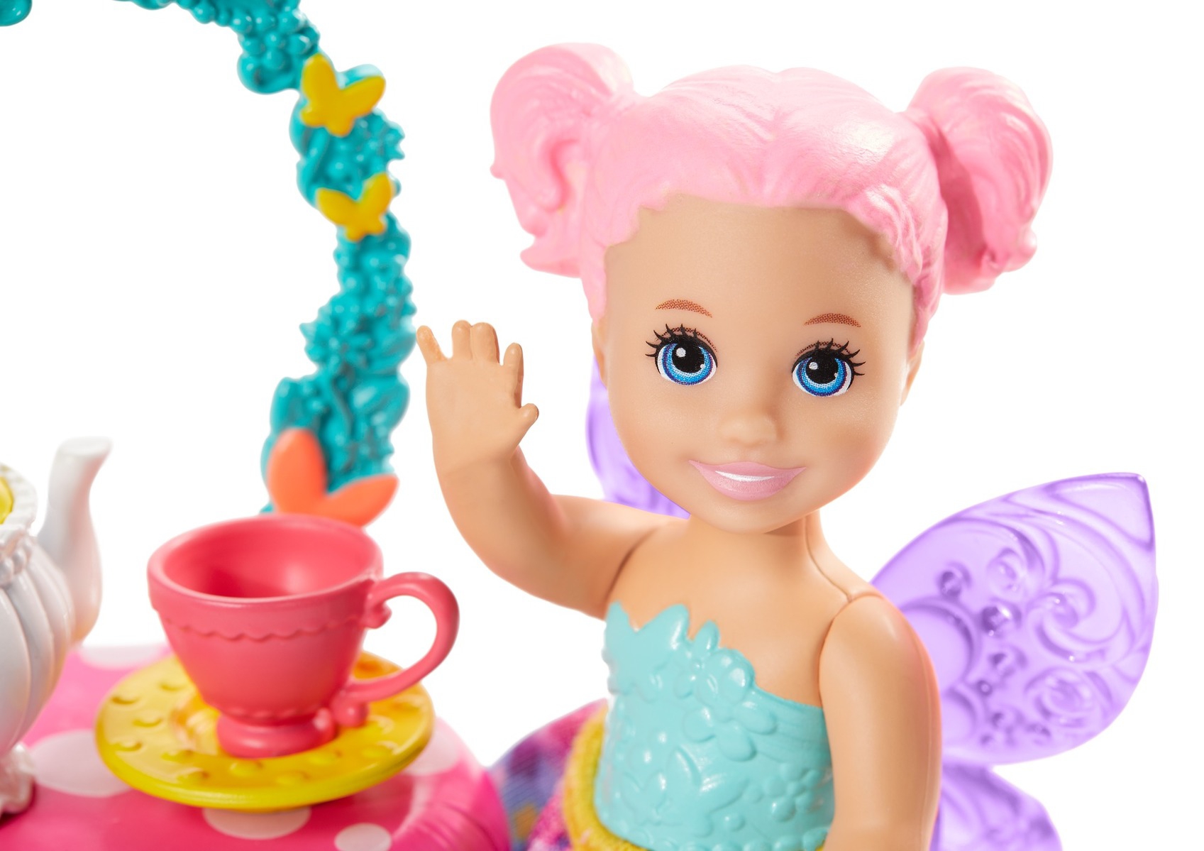 Ce coffret sur le thème du goûter des fées associe une poupée Barbie aux petits personnages et aux accessoires de jeu.