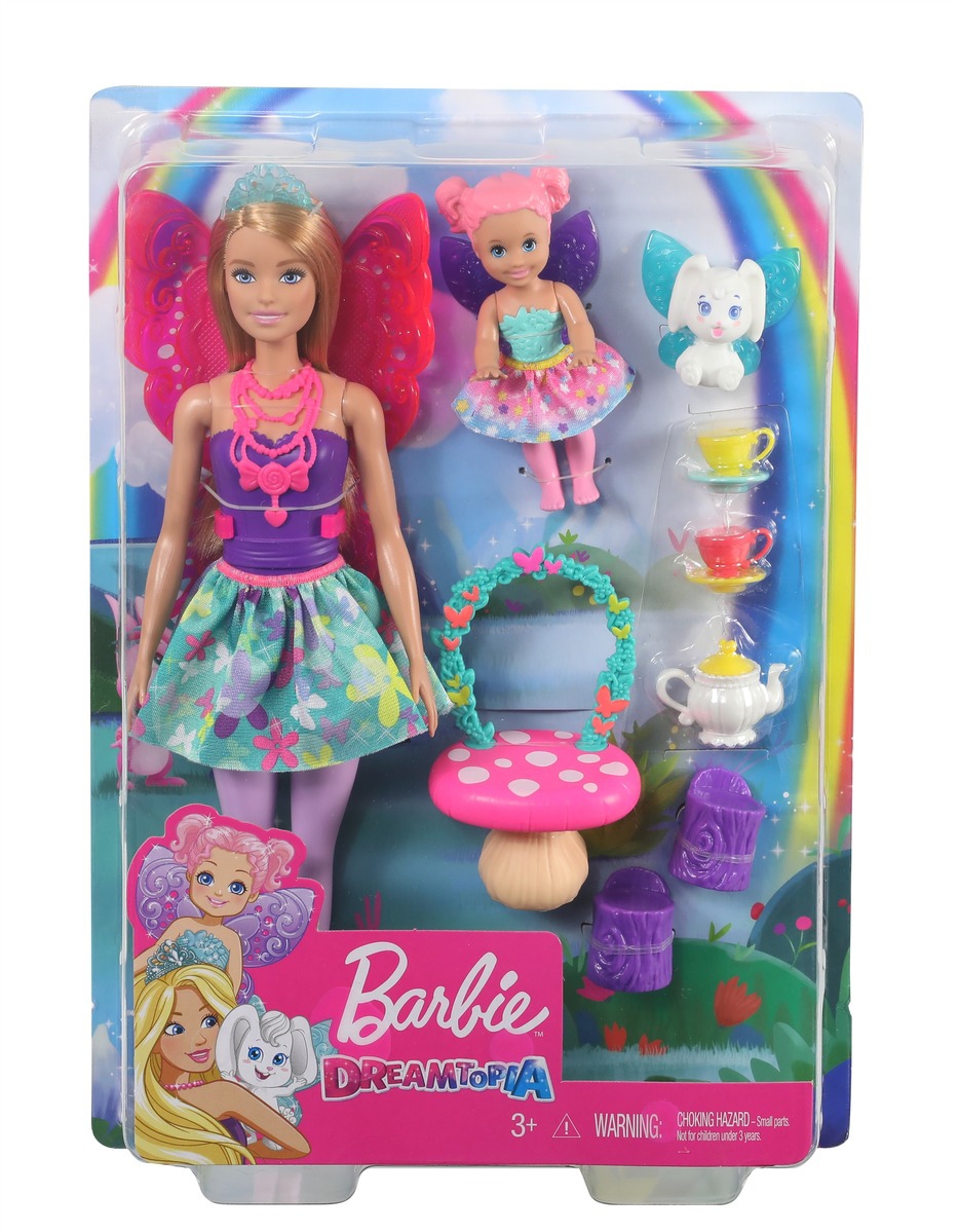 | Plus produit | Laissez-vous aller aux rêves les plus magiques avec cette Barbie Fée Dreamtopia et son service à thé ! § Les amis de Barbie, une petite fille et un lapin, sont aussi invités. Chacun de ces mignons compagnons possède des ailes amovibles et des détails enchanteurs comme une jupe colorée féérique. § Une table originale en forme de champignon agrémentée dune arche de papillons et de deux sièges plantent le décor. § Cette Barbie fée arbore une tenue magique composée dun bustier de couleur vive, dune jupe à motifs et dun accessoire de coiffure, dailes et dun collier. § Dautres petits objets rendent le jeu encore plus intéressant comme une théière colorée, 2 tasses et 2 soucoupes. § Inspirez aux enfants de 3 à 7 ans des histoires féériques avec cette poupée Barbie fée et son service à thé ! Collectionnez dautres poupées et jouets Barbie Dreamtopia et envolez-vous vers un pays magique (tous vendus séparément). |