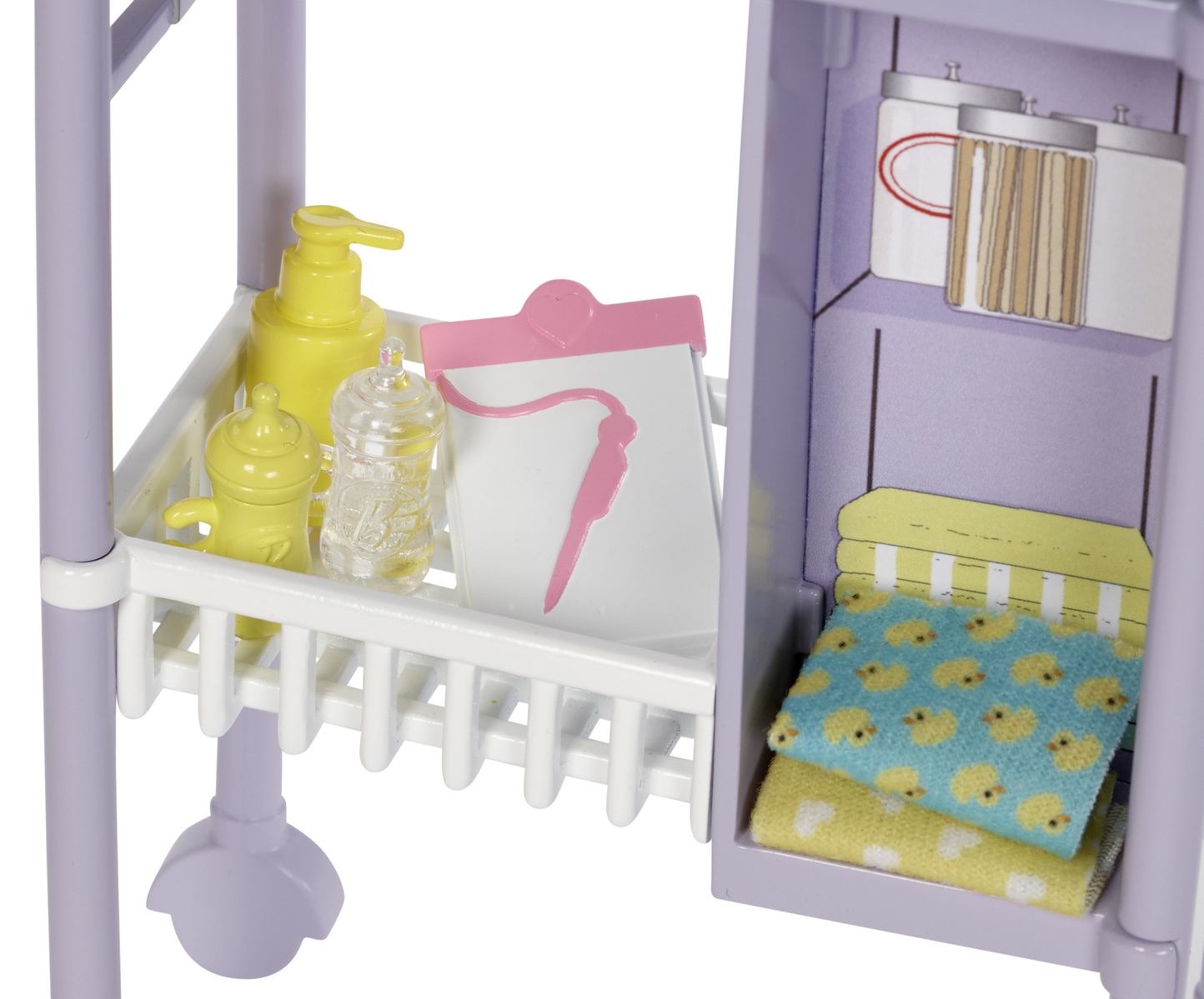 Coffret poupée et deux bébés avec mobilier et petits accessoires sur le thème de la pédiaterie.