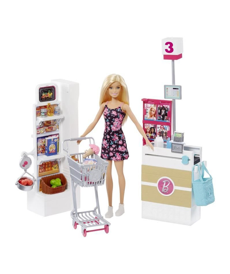 | Plus produit | Ce coffret Supermarché dispose de tous les ingrédients pour s\'amuser ! Inclut une poupée Barbie , un comptoir-caisse et son tapis roulant, un présentoir, un caddie roulant, des accessoires produits à ranger sur les étagères. § Déposez vos achats sur le tapis roulant du comptoir-caisse et faites glisser le levier pour les déplacer jusqu\'à les faire tomber dans le sac de course suspendu au crochet à l\'autre bout. § Barbie fait ses courses : trois côtés ont des étagères pour les aliments, il y a un panier pour les produits et une balance qui bouge pour alimenter le jeu de rôle. § L\'inventaire comprend 20 éléments produits, comme le lait, les oeufs, les pommes, le yaourt, le miel et les fleurs. Certains éléments ont des poignées pour tenir dans la main de la poupée Barbie et sont dotés de tige pour être fixés au coffret et rester en place pour faciliter le jeu dynamique. § La poupée Barbie porte une robe-combinaison noire avec un imprimé fleuri et des baskets blanches. |