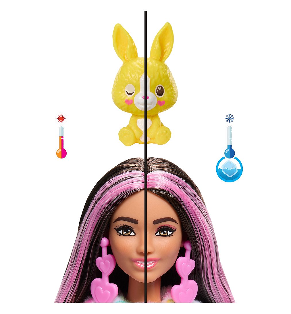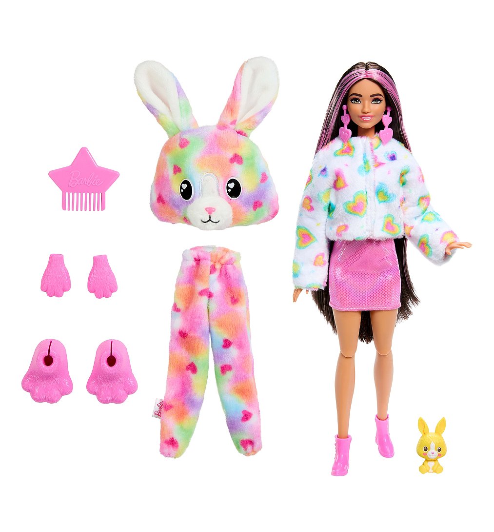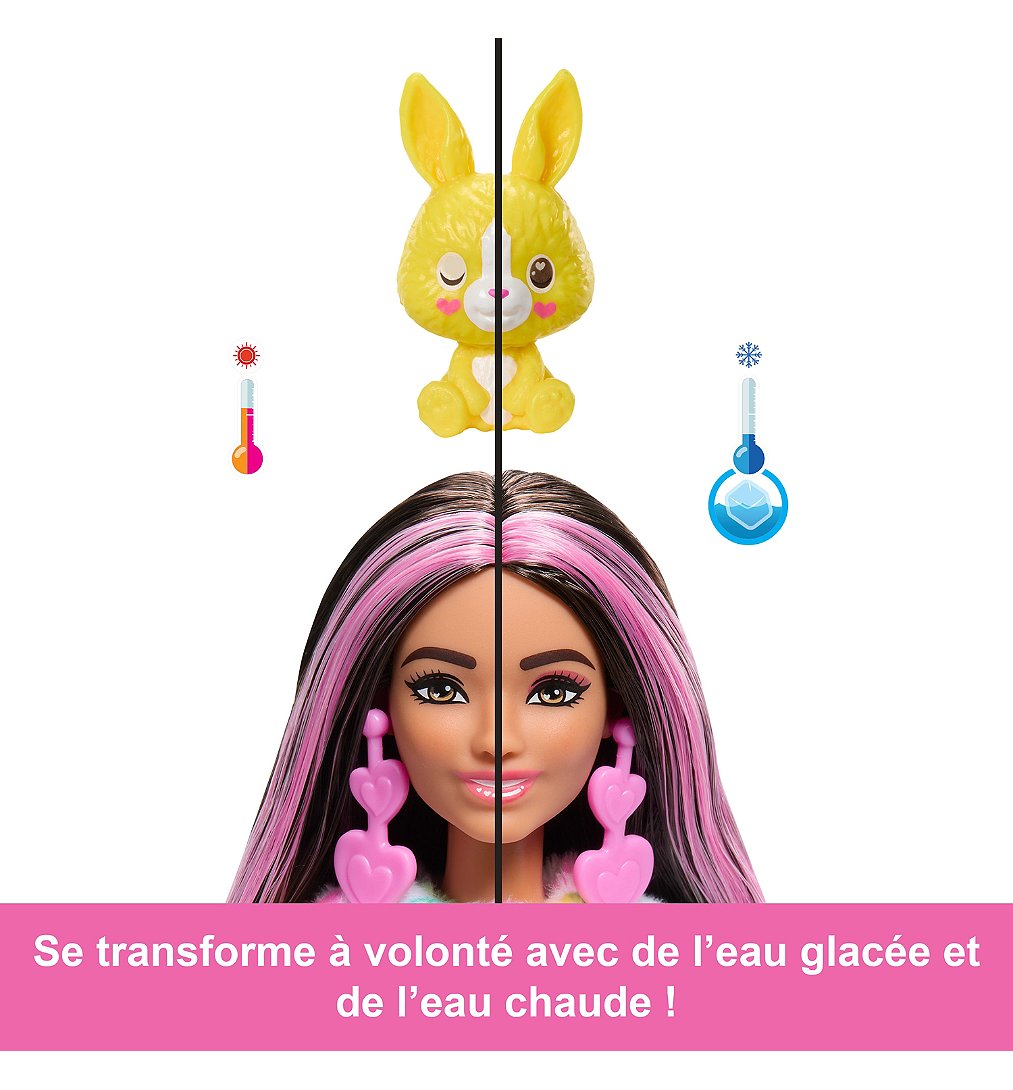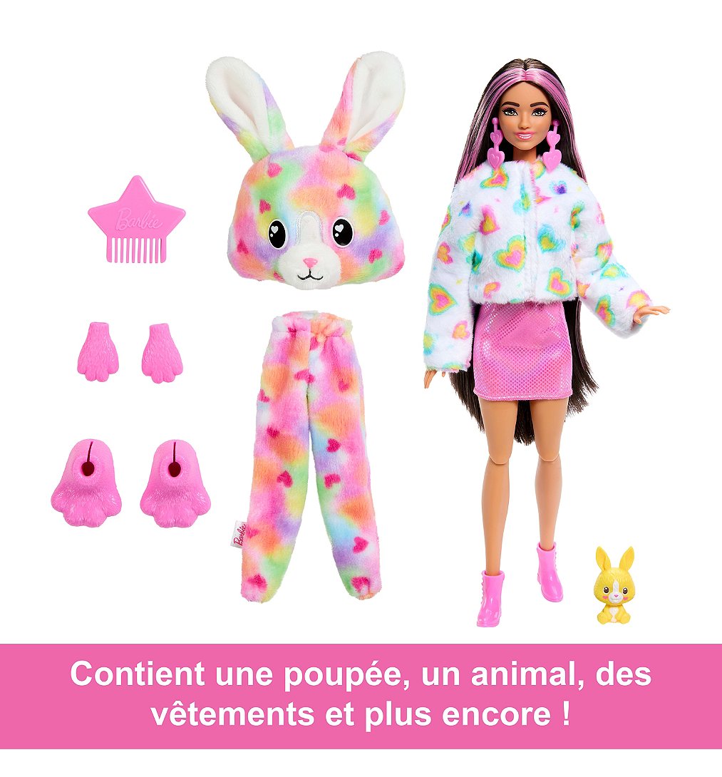 10 surprises sont à découvrir ! 1 Barbie, 2 changements de couleur, 1 déguisement de lapin tout doux 2 en 1, 1 lapereau et 4 accessoires.